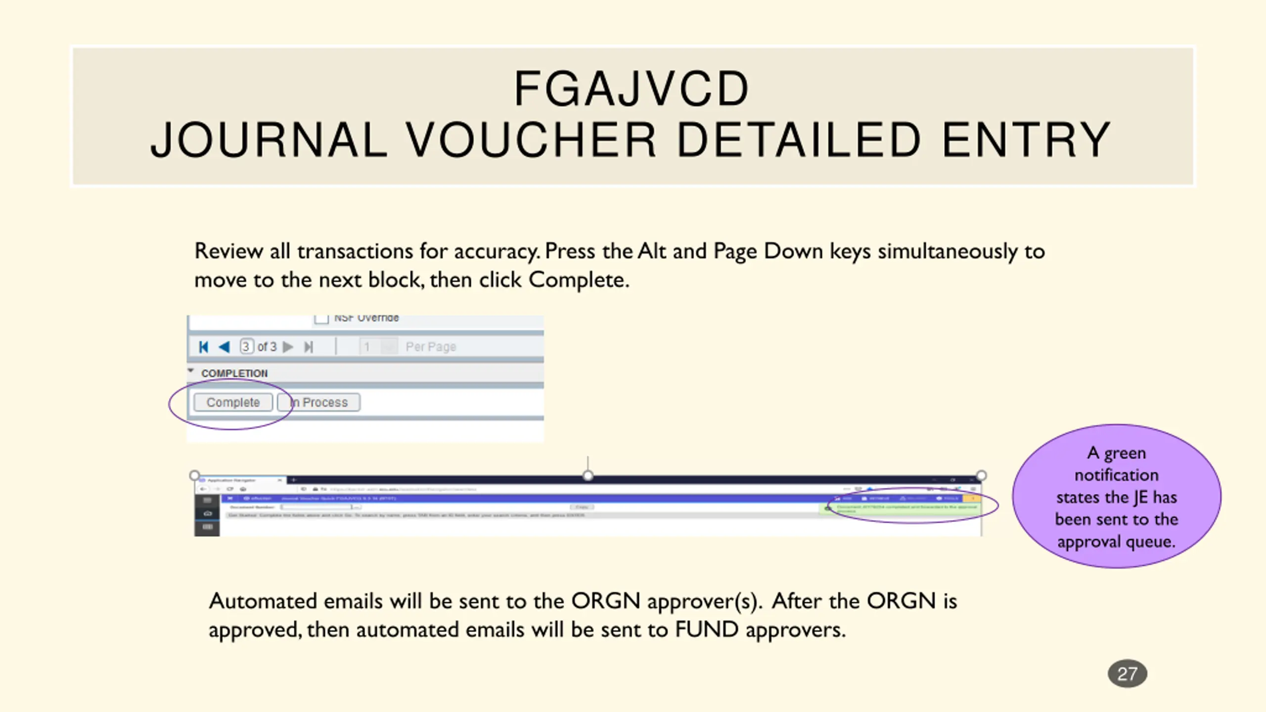FGAJVCD JOURNAL VOUCHER DETAILED ENTRY Review all transactions for accuracy. Press the Alt and Page Down keys simultaneously to move to the next block, then click Complete. A green notification states the JE has been sent to the approval queue. Automated emails will be sent to the ORGN approver(s). After the ORGN is approved, then automated emails will be sent to FUND approvers. 27