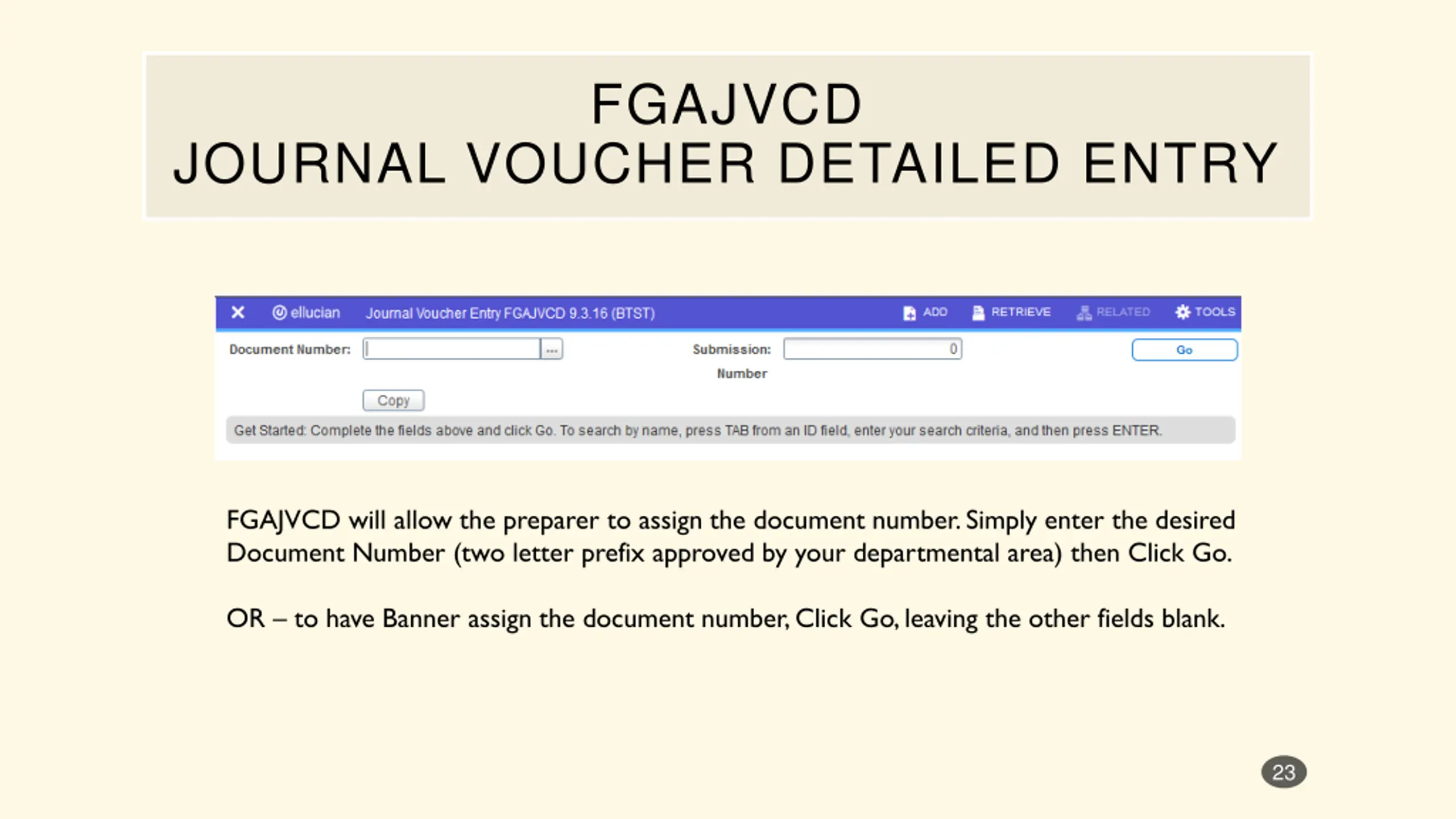 FGAJVCD JOURNAL VOUCHER DETAILED ENTRY FGAJVCD will allow the preparer to assign the document number. Simply enter the desired Document Number (two letter prefix approved by your departmental area) then Click Go. OR to have Banner assign the document number, Click Go, leaving the other fields blank. 23