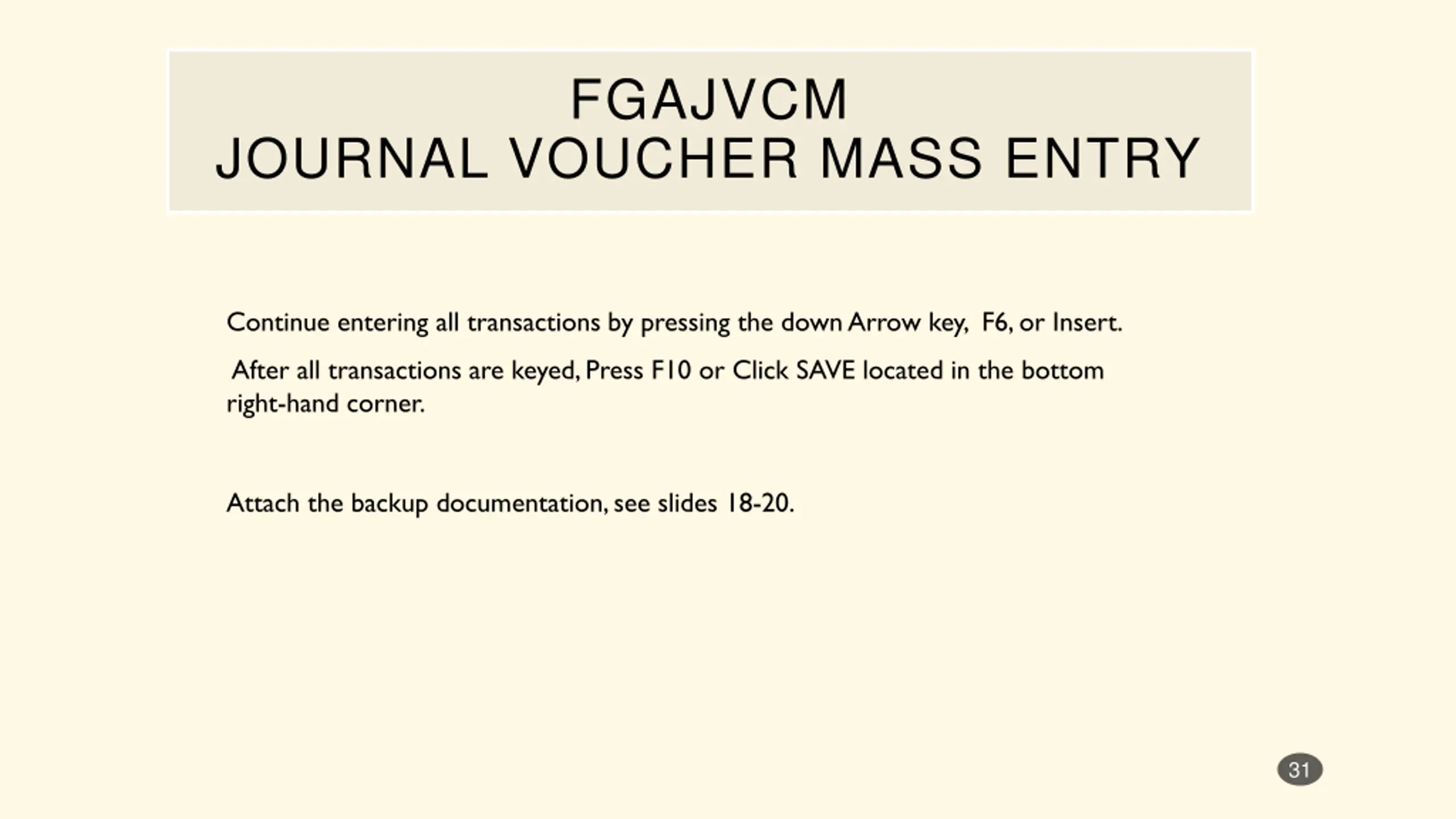 FGAJVCM JOURNAL VOUCHER MASS ENTRY Continue entering all transactions by pressing the down Arrow key, F6, or Insert. After all transactions are keyed, Press F10 or Click SAVE located in the bottom right-hand corner. Attach the backup documentation, see slides 18-20. 31