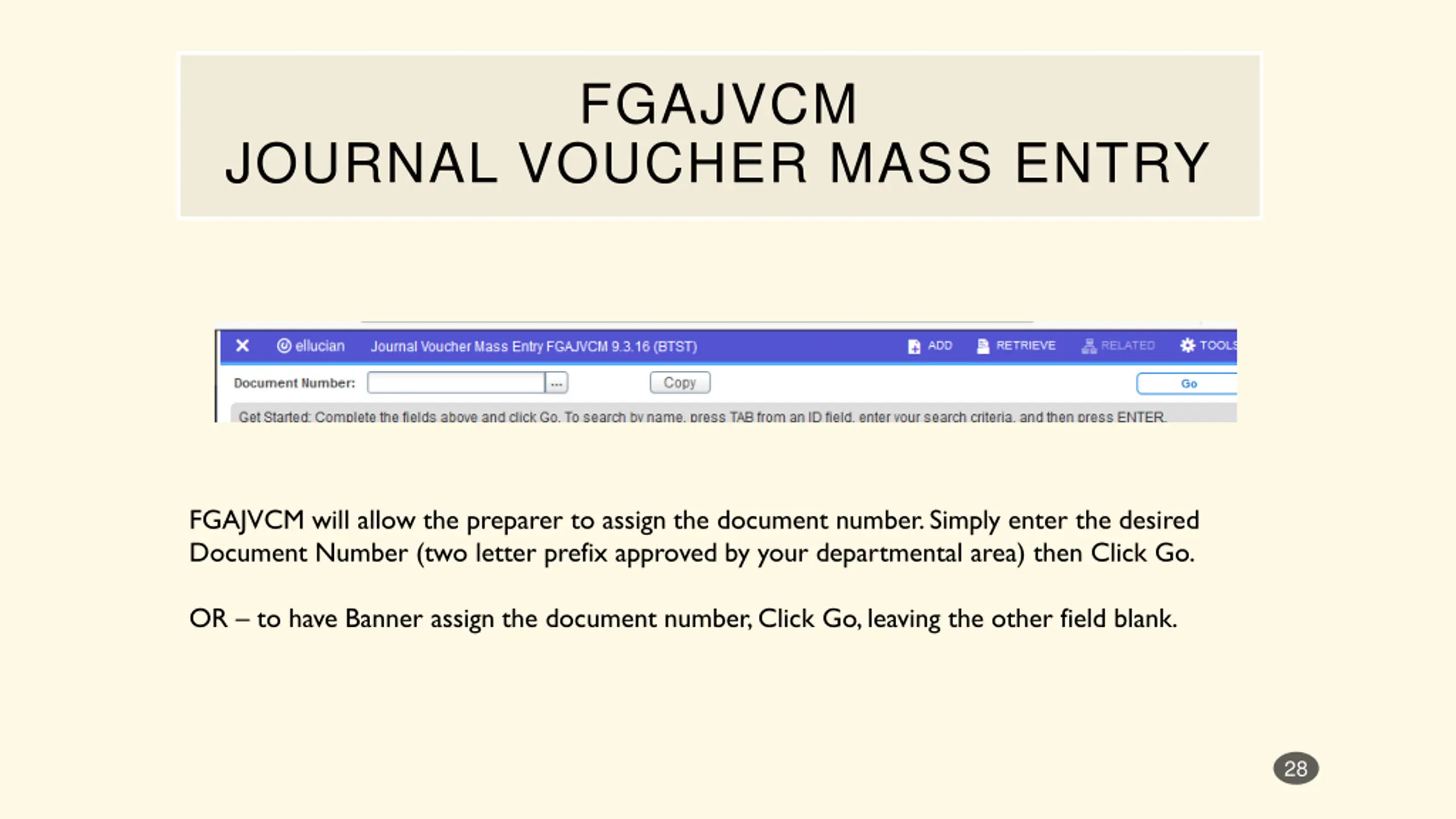 FGAJVCM JOURNAL VOUCHER MASS ENTRY FGAJVCM will allow the preparer to assign the document number. Simply enter the desired Document Number (two letter prefix approved by your departmental area) then Click Go. OR to have Banner assign the document number, Click Go, leaving the other field blank. 28
