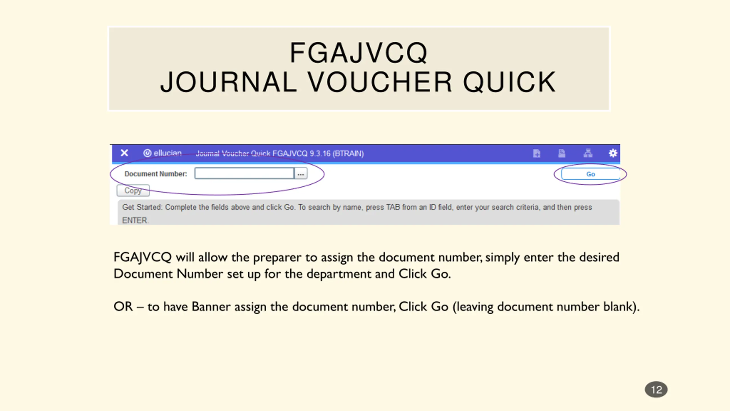 FGAJVCQ JOURNAL VOUCHER QUICK FGAJVCQ will allow the preparer to assign the document number, simply enter the desired Document Number set up for the department and Click Go. OR to have Banner assign the document number, Click Go (leaving document number blank). 12
