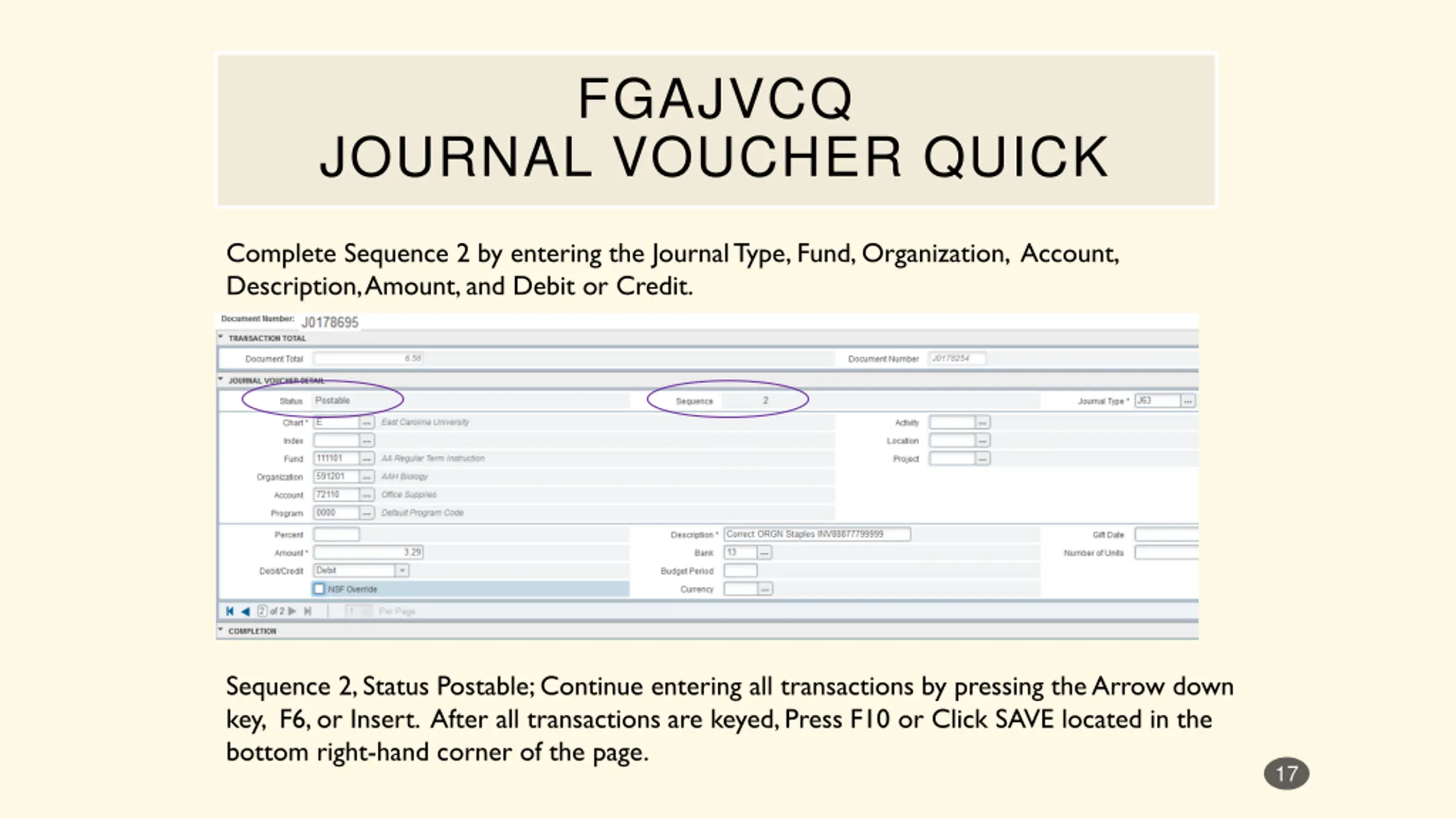 FGAJVCQ JOURNAL VOUCHER QUICK Complete Sequence 2 by entering the Journal Type, Fund, Organization, Account, Description, Amount, and Debit or Credit. Sequence 2, Status Postable; Continue entering all transactions by pressing the Arrow down key, F6, or Insert. After all transactions are keyed, Press F10 or Click SAVE located in the bottom right-hand corner of the page. 17