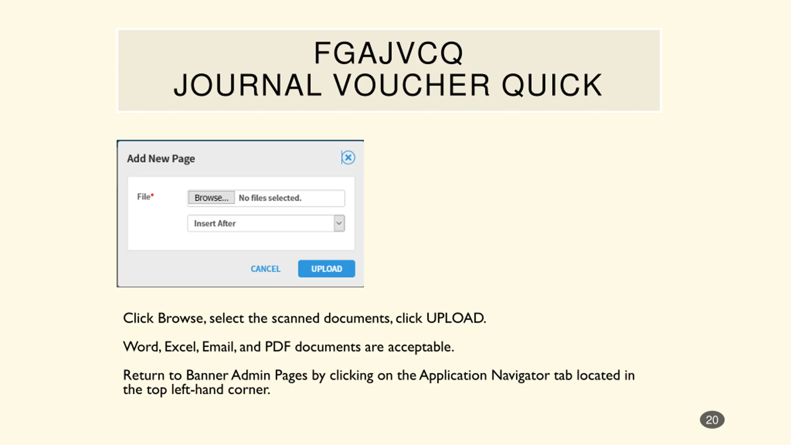 FGAJVCQ JOURNAL VOUCHER QUICK Click Browse, select the scanned documents, click UPLOAD. Word, Excel, Email, and PDF documents are acceptable. Return to Banner Admin Pages by clicking on the Application Navigator tab located in the top left-hand corner. 20