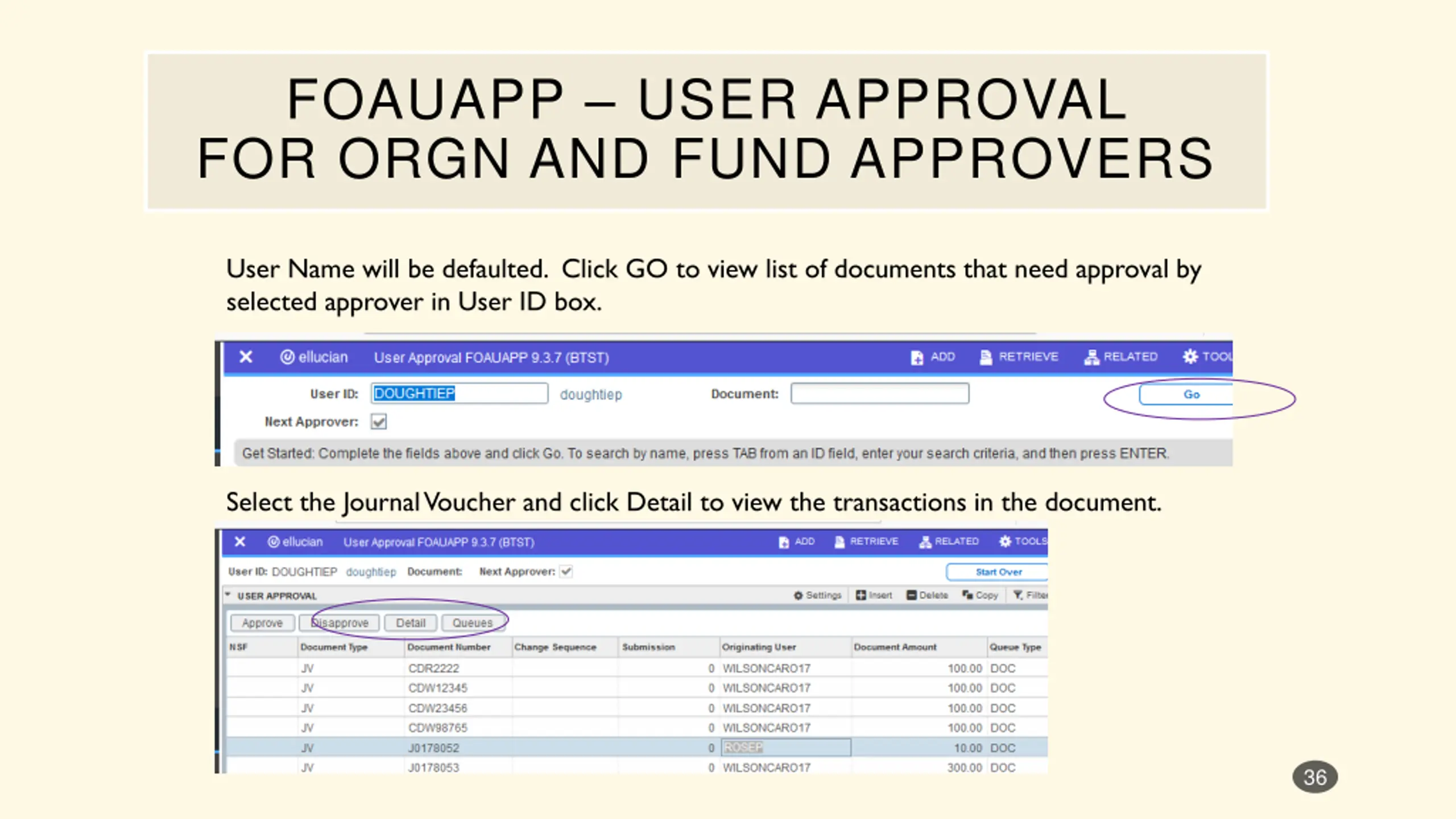 FOAUAPP USER APPROVAL FOR ORGN AND FUND APPROVERS User Name will be defaulted. Click GO to view list of documents that need approval by selected approver in User ID box. Select the Journal Voucher and click Detail to view the transactions in the document. 36