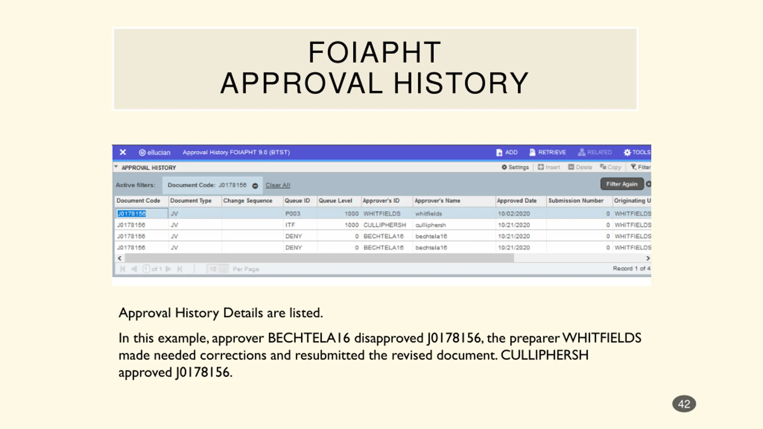 FOIAPHT APPROVAL HISTORY Approval History Details are listed. In this example, approver BECHTELA16 disapproved J0178156, the preparer WHITFIELDS made needed corrections and resubmitted the revised document. CULLIPHERSH approved J0178156. 42