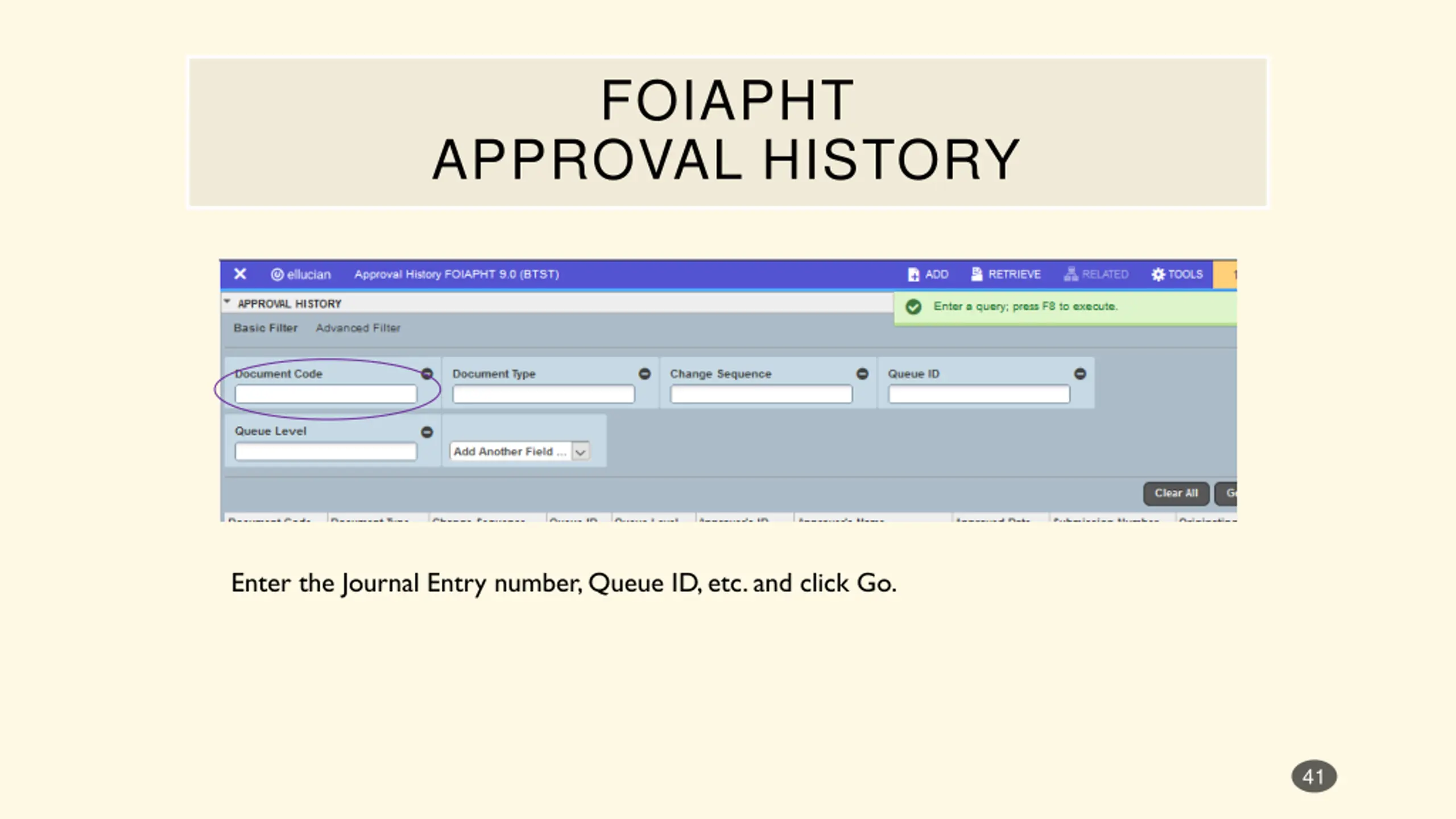 FOIAPHT APPROVAL HISTORY Enter the Journal Entry number, Queue ID, etc. and click Go. 41