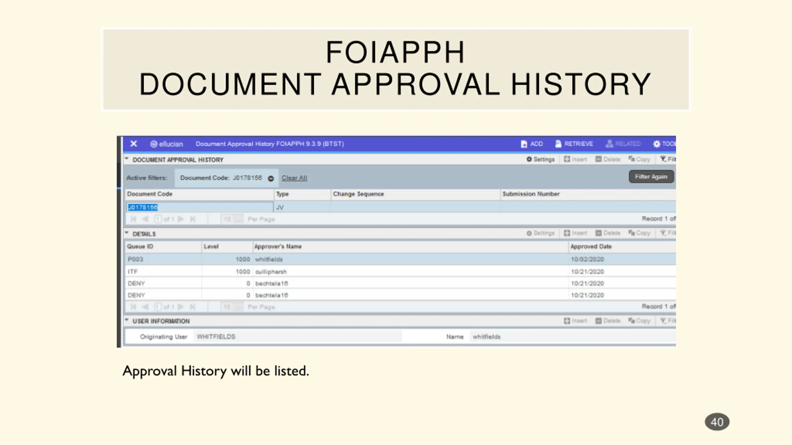 FOIAPPH DOCUMENT APPROVAL HISTORY Approval History will be listed. 40