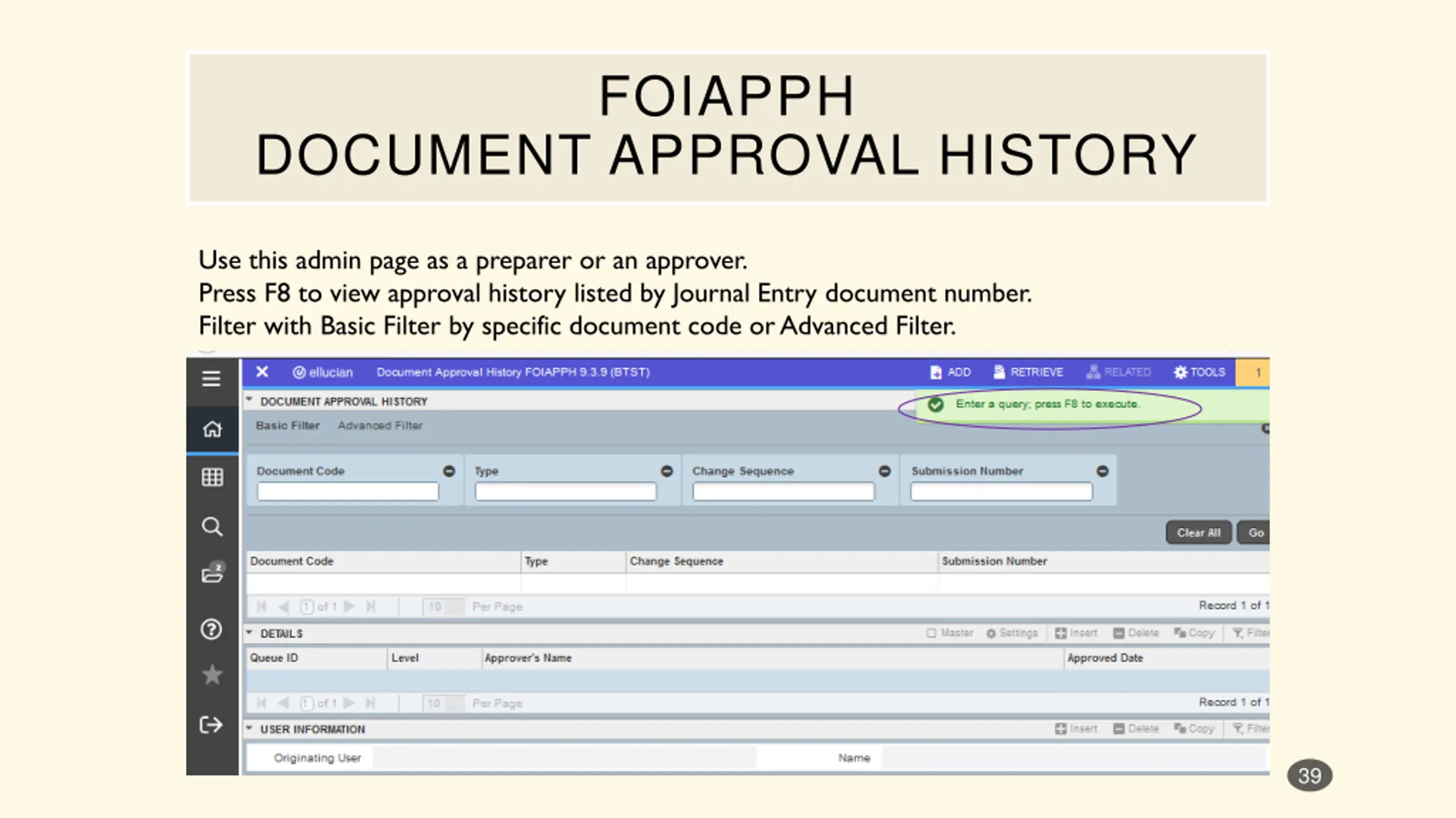 FOIAPPH DOCUMENT APPROVAL HISTORY Use this admin page as a preparer or an approver. Press F8 to view approval history listed by Journal Entry document number. Filter with Basic Filter by specific document code or Advanced Filter. A 39
