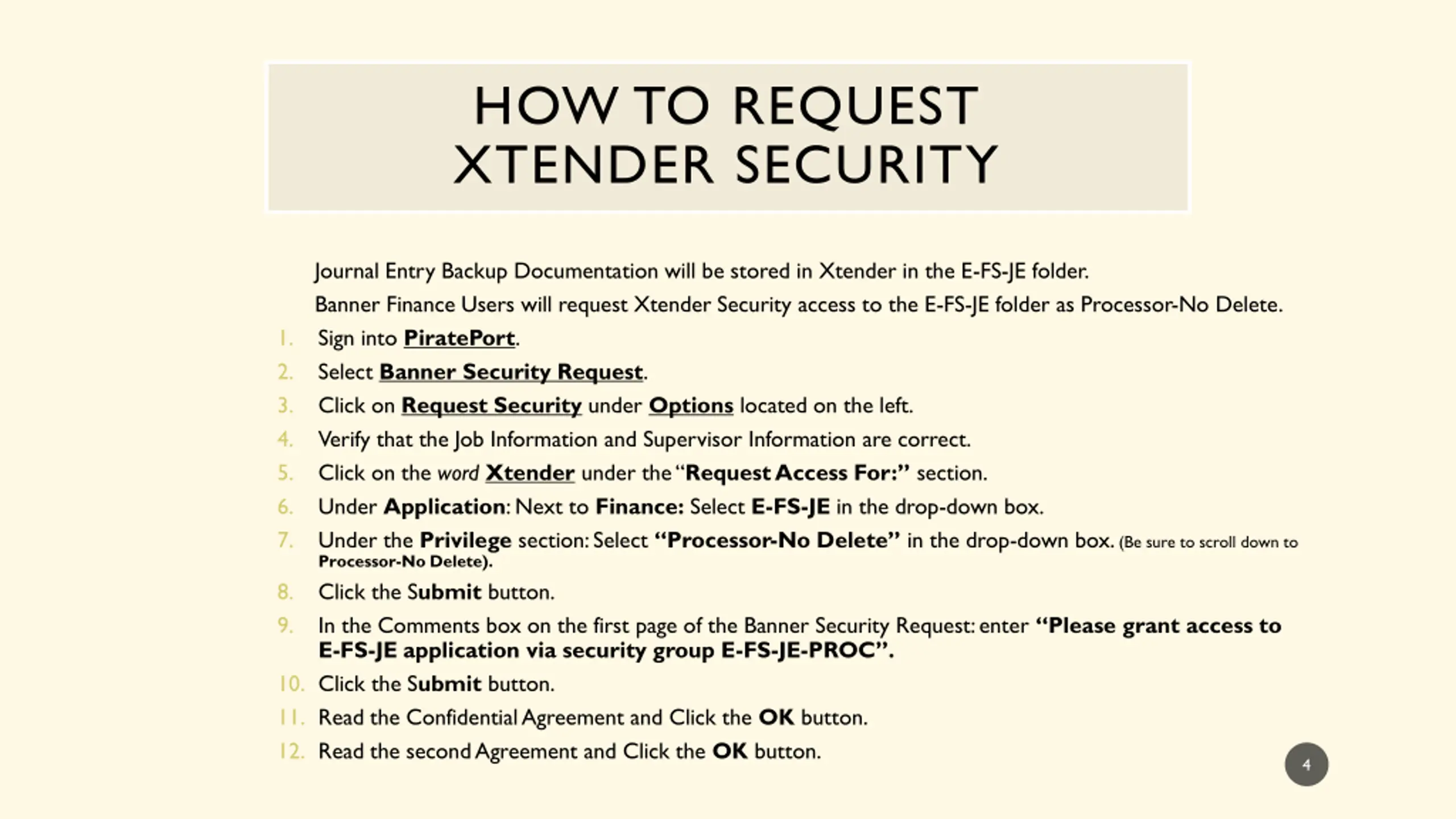 HOW TO REQUEST XTENDER SECURITY Journal Entry Backup Documentation will be stored in Xtender in the E-FS-JE folder. Banner Finance Users will request Xtender Security access to the E-FS-JE folder as Processor-No Delete. 1. Sign into PiratePort. 2. Select Banner Security Request. 3. Click on Request Security under Options located on the left. 4. Verify that the Job Information and Supervisor Information are correct. 5. Click on the wordXtenderunder the Request Access For: section. 6. Under Application: Next to Finance: Select E-FS-JE in the drop-down box. 7. Under the Privilege section: Select Processor-No Delete in the drop-down box. (Be sure to scroll down to Processor-No Delete). 8. Click the Submit button. 9. In the Comments box on the first page of the Banner Security Request: enter Please grant access to E-FS-JEapplication via security group E-FS-JE-PROC . 10. Click the Submit button. 11. Read the Confidential Agreement and Click the OK button. 12. Read the second Agreement and Click the OK button. 4