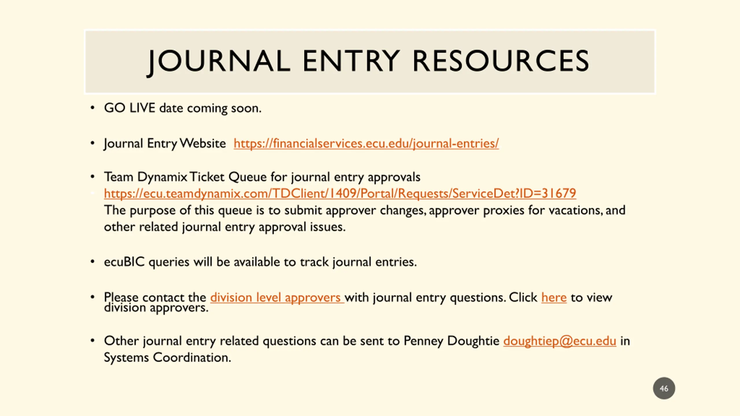 JOURNAL ENTRY RESOURCES GO LIVE date coming soon. Journal Entry Website https://financialservices.ecu.edu/journal-entries/. Team Dynamix Ticket Queue for journal entry approvals https://ecu.teamdynamix.com/TDClient/1409/Portal/Requests/ServiceDet?ID=31679 The purpose of this queue is to submit approver changes, approver proxies for vacations, and other related journal entry approval issues. ecuBIC queries will be available to track journal entries. Please contact the division level approvers with journal entry questions. Click here to view division approvers. Other journal entry related questions can be sent to Penney Doughtie doughtiep@ecu.edu in Systems Coordination. 46