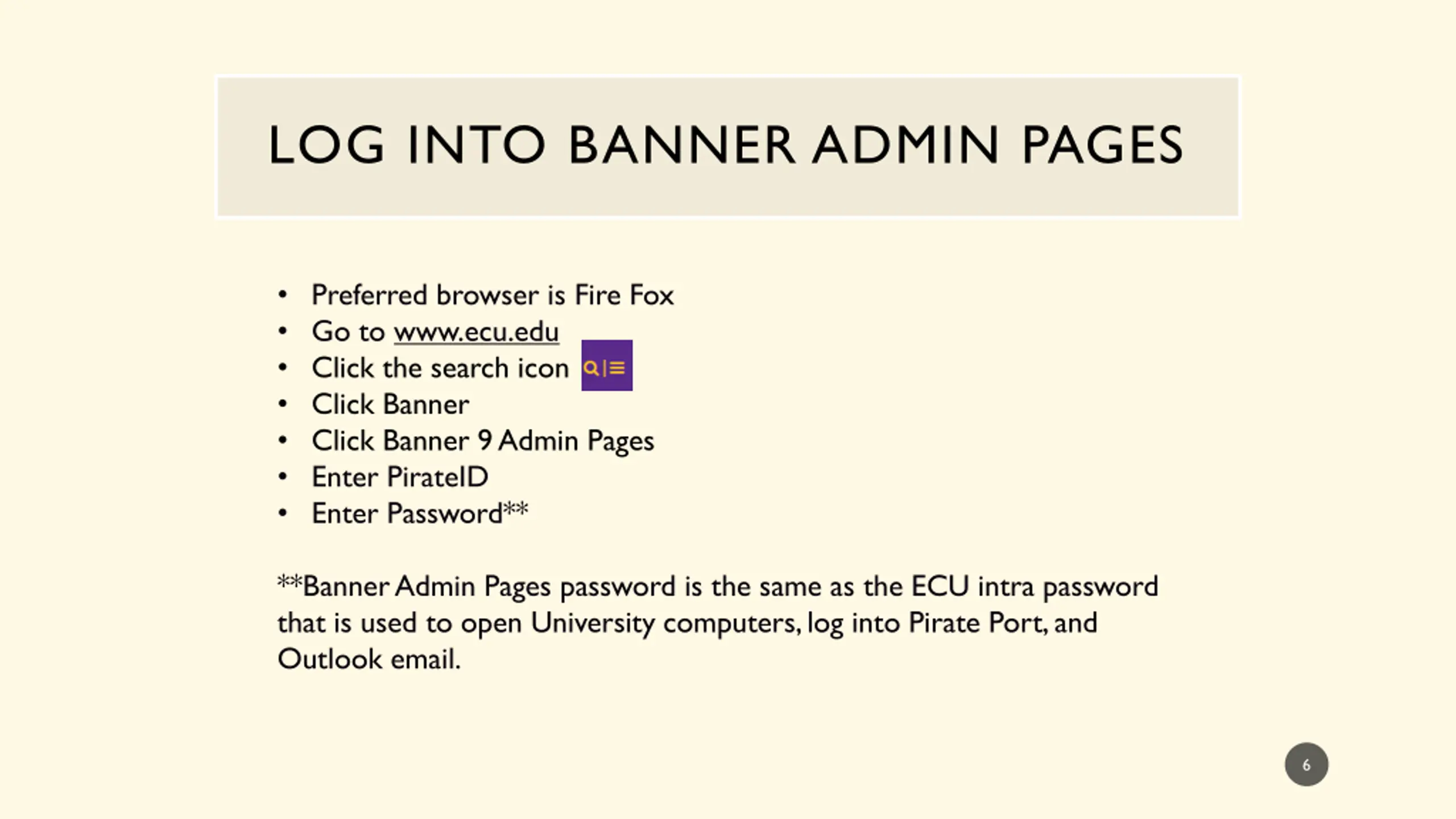 LOG INTO BANNER ADMIN PAGES Preferred browser is Fire Fox Go to www.ecu.edu Click the search icon Click Banner Click Banner 9 Admin Pages Enter PirateID Enter Password** **Banner Admin Pages password is the same as the ECU intra password that is used to open University computers, log into Pirate Port, and Outlook email. 6