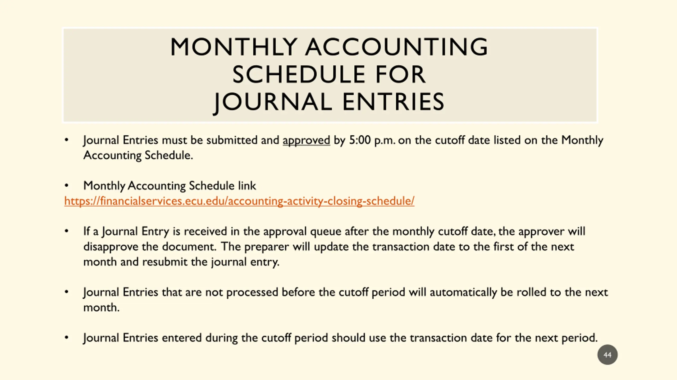 MONTHLY ACCOUNTING SCHEDULE FOR JOURNAL ENTRIES Journal Entries must be submitted and approved by 5:00 p.m. on the cutoff date listed on the Monthly Accounting Schedule. Monthly Accounting Schedule link https://financialservices.ecu.edu/accounting-activity-closing-schedule/ If a Journal Entry is received in the approval queue after the monthly cutoff date, the approver will disapprove the document. The preparer will update the transaction date to the first of the next month and resubmit the journal entry. Journal Entries that are not processed before the cutoff period will automatically be rolled to the next month. Journal Entries entered during the cutoff period should use the transaction date for the next period. 44