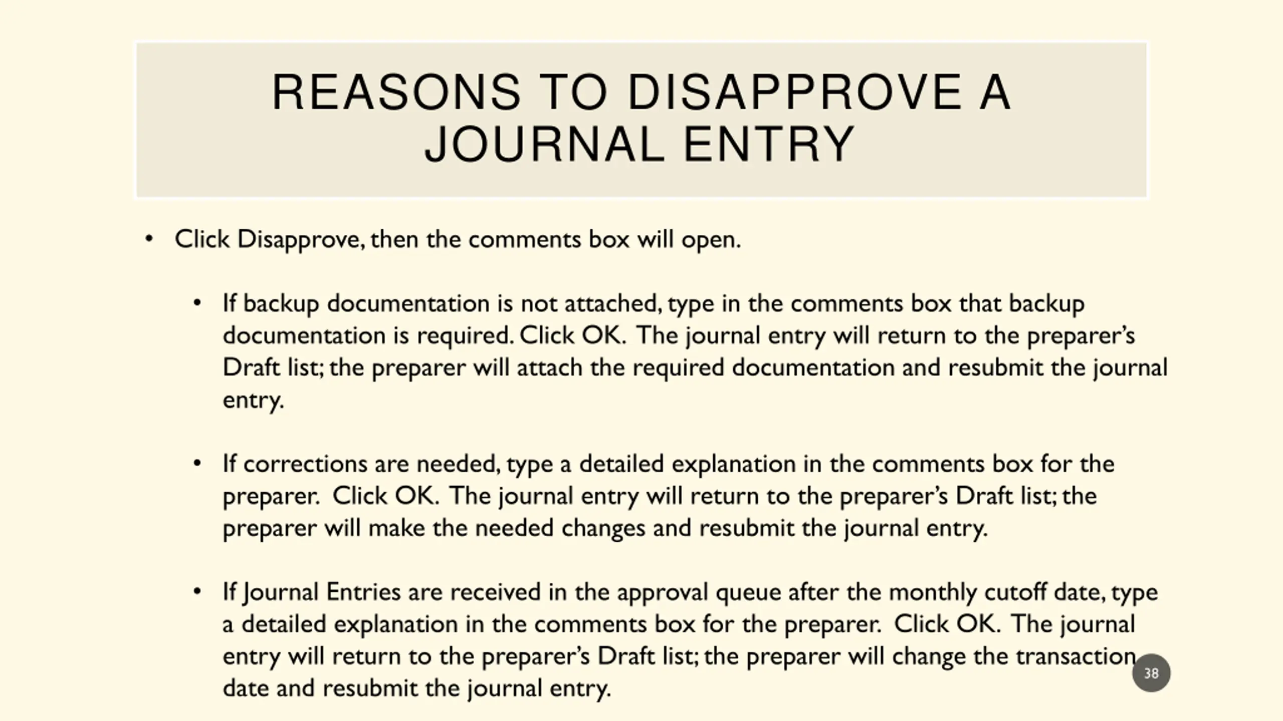 REASONS TO DISAPPROVE A JOURNAL ENTRY Click Disapprove, then the comments box will open. If backup documentation is not attached, type in the comments box that backup documentation is required. Click OK. The journal entry will return to the preparer s Draft list; the preparer will attach the required documentation and resubmit the journal entry. If corrections are needed, type a detailed explanation in the comments box for the preparer. Click OK. The journal entry will return to the preparer s Draft list; the preparer will make the needed changes and resubmit the journal entry. If Journal Entries are received in the approval queue after the monthly cutoff date, type a detailed explanation in the comments box for the preparer. Click OK. The journal entry will return to the preparer s Draft list; the preparer will change the transaction date and resubmit the journal entry. 38
