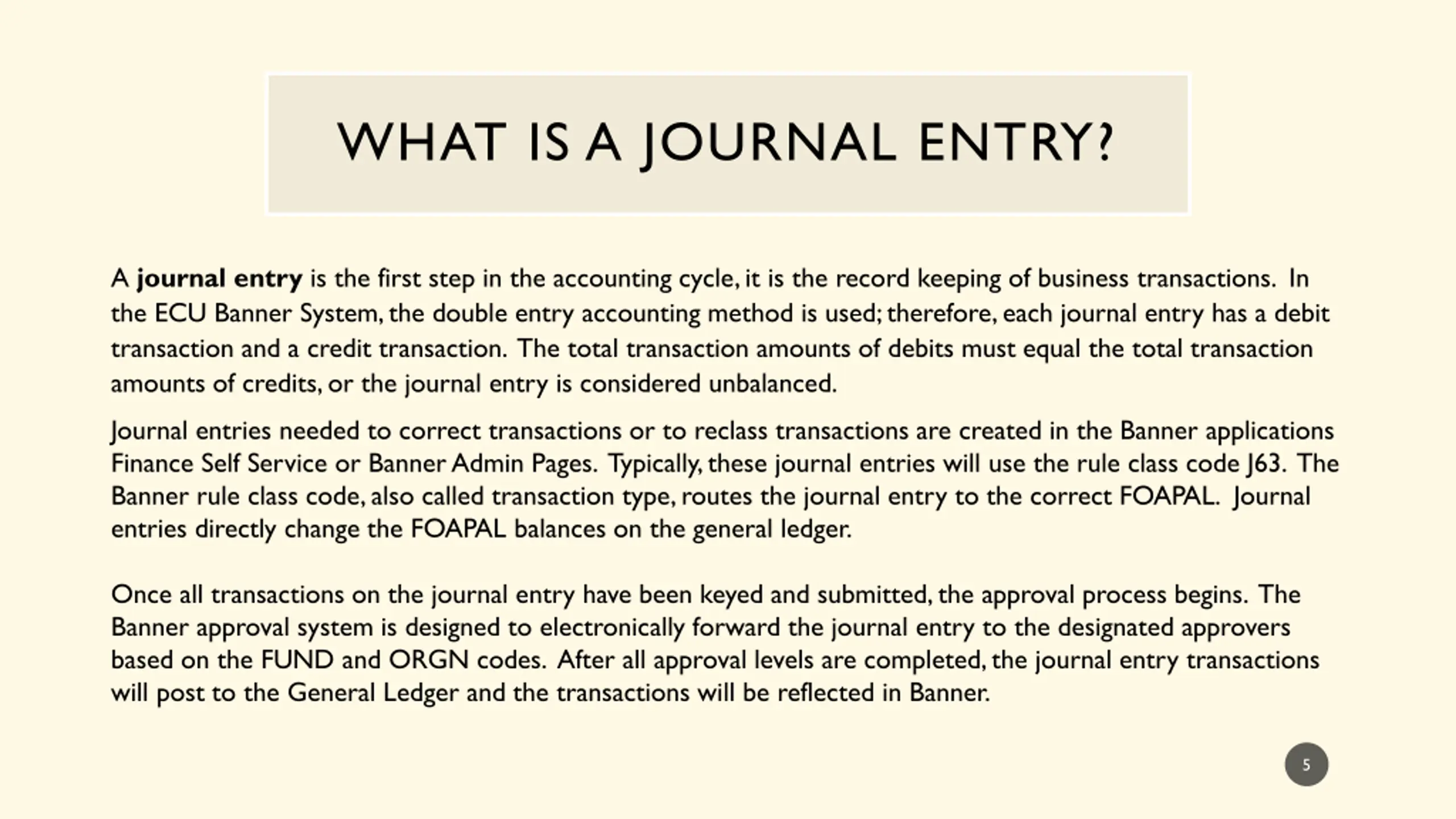 WHAT IS A JOURNAL ENTRY? A journal entry is the first step in the accounting cycle, it is the record keeping of business transactions. In the ECU Banner System, the double entry accounting method is used; therefore, each journal entry has a debit transaction and a credit transaction. The total transaction amounts of debits must equal the total transaction amounts of credits, or the journal entry is considered unbalanced. Journal entries needed to correct transactions or to reclass transactions are created in the Banner applications Finance Self Service or Banner Admin Pages. Typically, these journal entries will use the rule class code J63. The Banner rule class code, also called transaction type, routes the journal entry to the correct FOAPAL. Journal entries directly change the FOAPAL balances on the general ledger. Once all transactions on the journal entry have been keyed and submitted, the approval process begins. The Banner approval system is designed to electronically forward the journal entry to the designated approvers based on the FUND and ORGN codes. After all approval levels are completed, the journal entry transactions will post to the General Ledger and the transactions will be reflected in Banner. 5