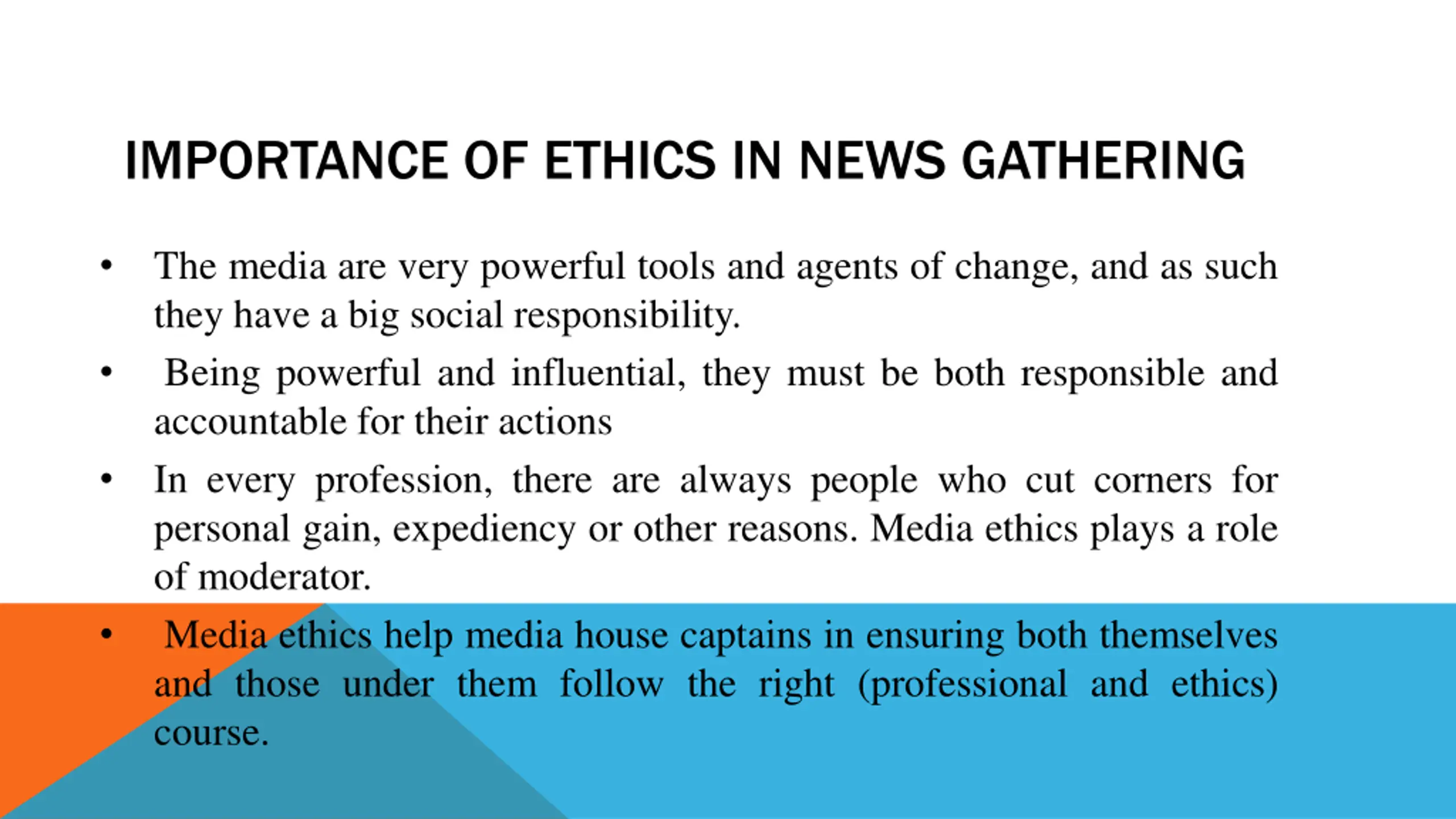 IMPORTANCE OF ETHICS IN NEWS GATHERING The media are very powerful tools and agents of change, and as such they have a big social responsibility. Being powerful and influential, they must be both responsible and accountable for their actions In every profession, there are always people who cut corners for personal gain, expediency or other reasons. Media ethics plays a role of moderator. Media ethics help media house captains in ensuring both themselves and those under them follow the right (professional and ethics) course.