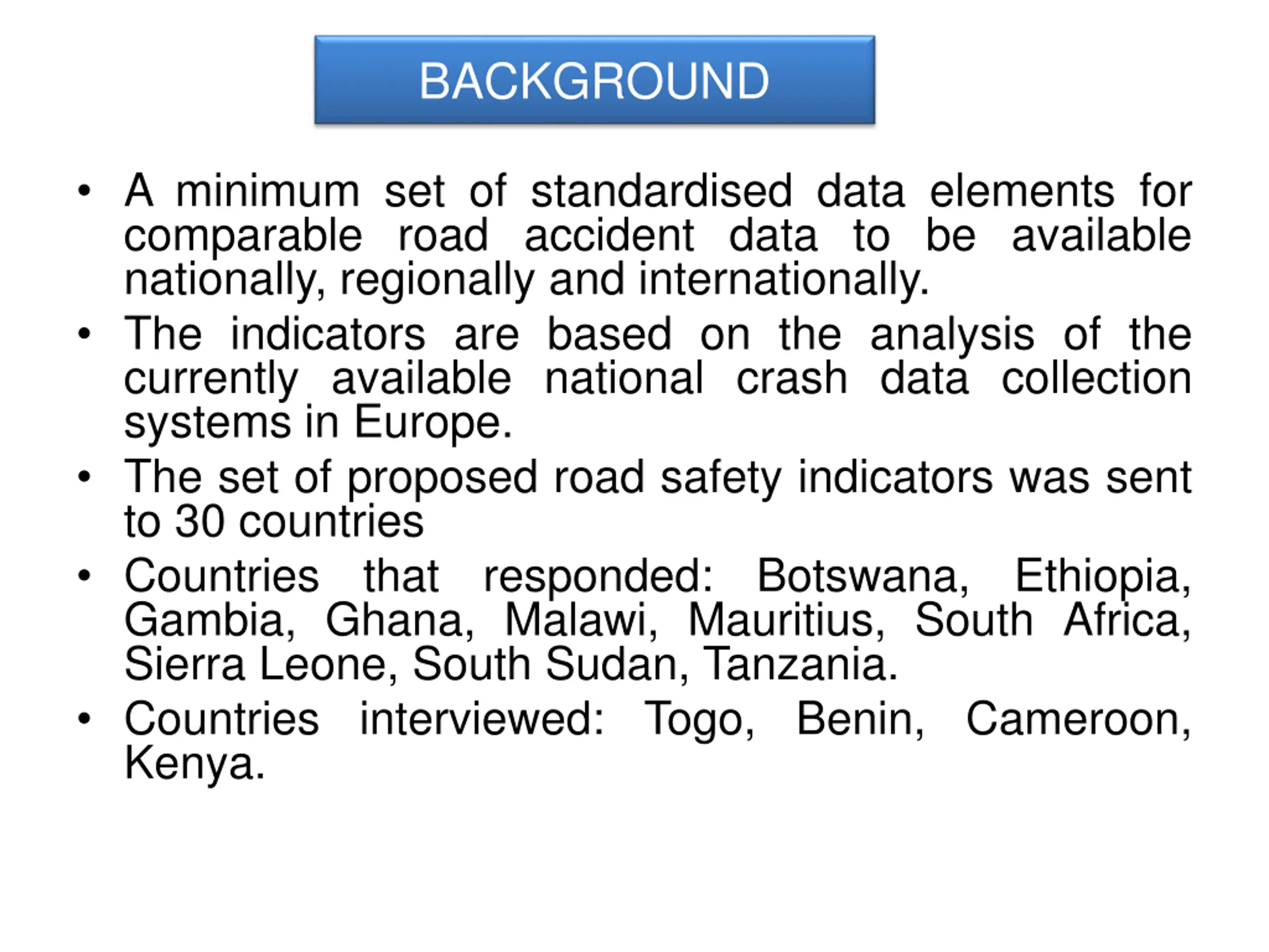BACKGROUND A minimum set of standardised data elements for comparable road accident data to be available nationally, regionally and internationally. The indicators are based on the analysis of the currently available national crash data collection systems in Europe. The set of proposed road safety indicators was sent to 30 countries Countries that responded: Gambia, Ghana, Malawi, Mauritius, South Africa, Sierra Leone, South Sudan, Tanzania. Countries interviewed: Togo, Benin, Cameroon, Kenya. Botswana, Ethiopia,