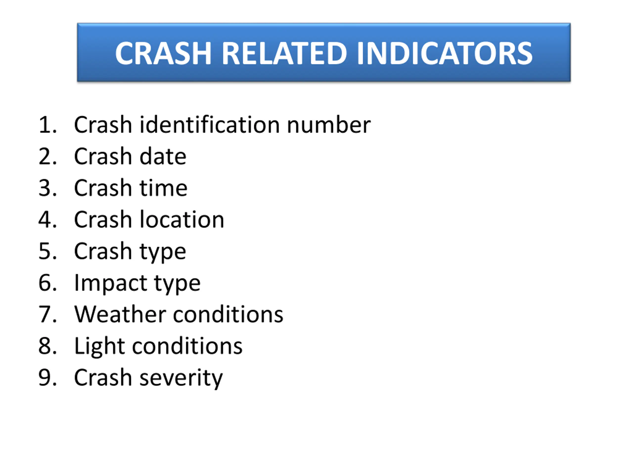 CRASH RELATED INDICATORS 1. Crash identification number 2. Crash date 3. Crash time 4. Crash location 5. Crash type 6. Impact type 7. Weather conditions 8. Light conditions 9. Crash severity