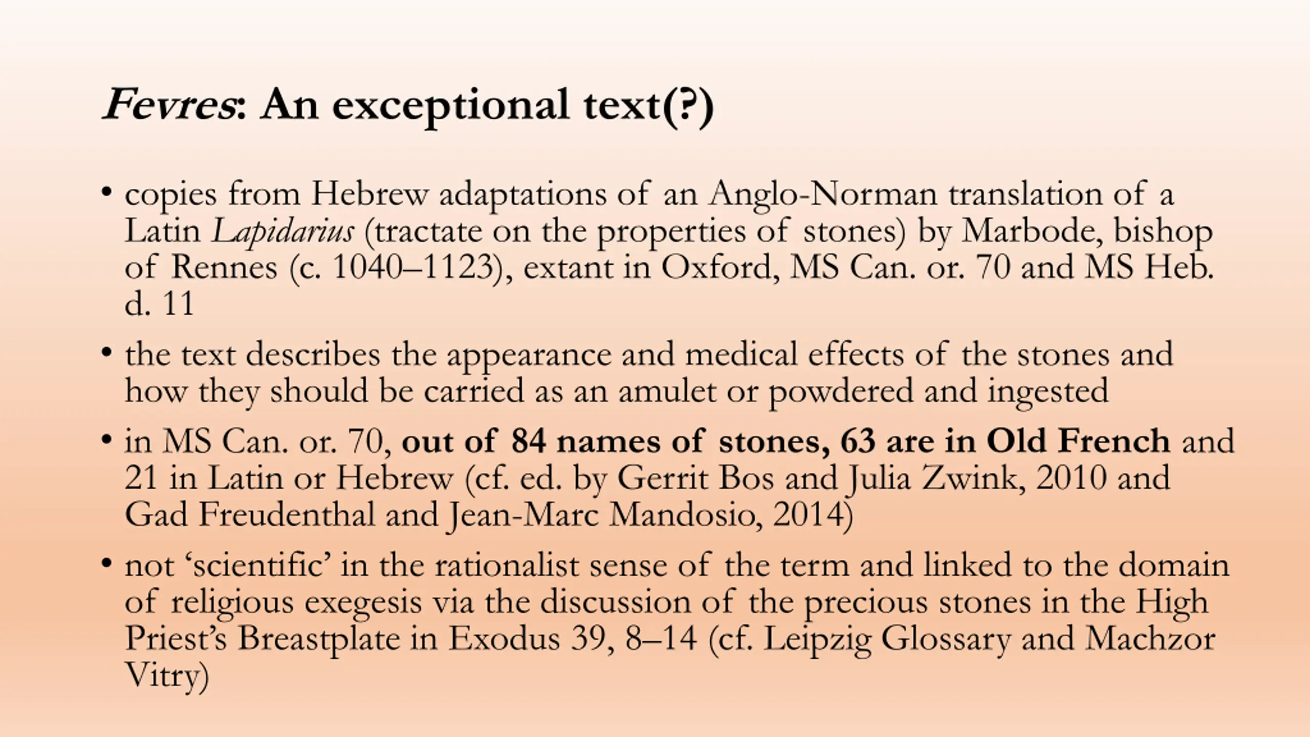 Fevres: An exceptional text(?) copies from Hebrew adaptations of an Anglo-Norman translation of a Latin Lapidarius (tractate on the properties of stones) by Marbode, bishop of Rennes (c. 1040 1123), extant in Oxford, MS Can. or. 70 and MS Heb. d. 11 the text describes the appearance and medical effects of the stones and how they should be carried as an amulet or powdered and ingested in MS Can. or. 70, out of 84 names of stones, 63 are in Old French and 21 in Latin or Hebrew (cf. ed. by Gerrit Bos and Julia Zwink, 2010 and Gad Freudenthal and Jean-Marc Mandosio, 2014) not scientific in the rationalist sense of the term and linked to the domain of religious exegesis via the discussion of the precious stones in the High Priest s Breastplate in Exodus 39, 8 14 (cf. Leipzig Glossary and Machzor Vitry)