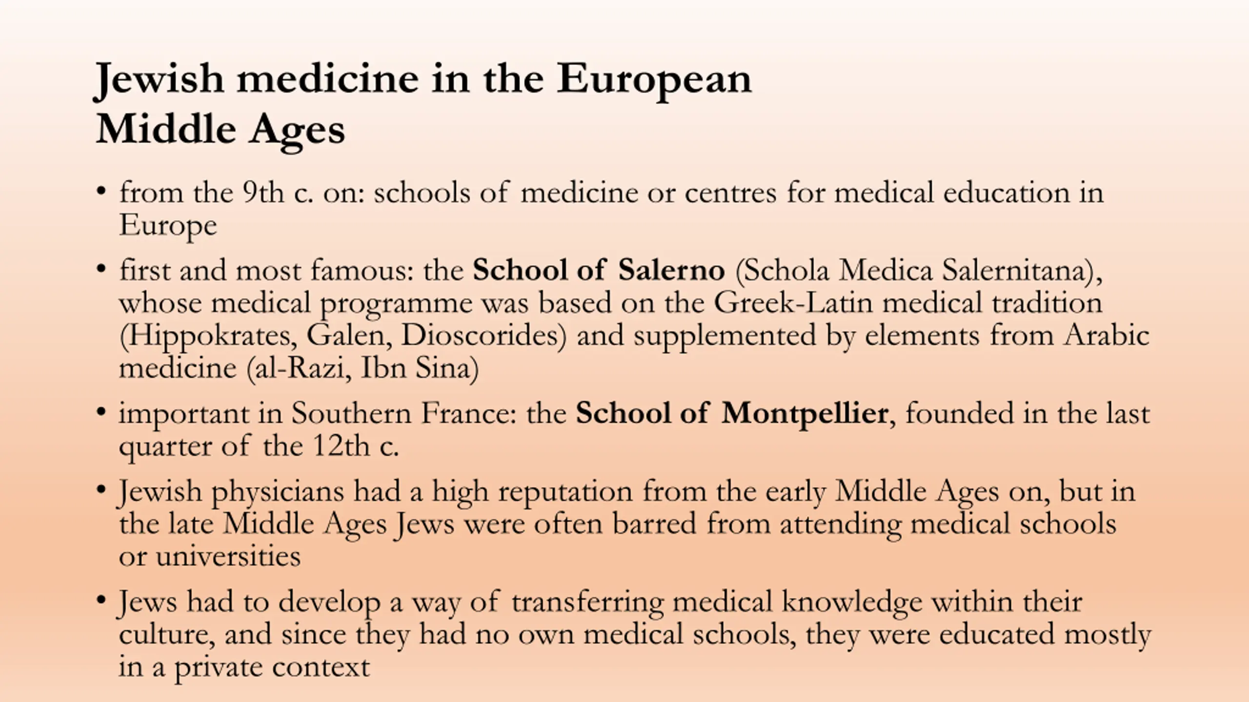 Jewish medicine in the European Middle Ages from the 9th c. on: schools of medicine or centres for medical education in Europe first and most famous: the School of Salerno (Schola Medica Salernitana), whose medical programme was based on the Greek-Latin medical tradition (Hippokrates, Galen, Dioscorides) and supplemented by elements from Arabic medicine (al-Razi, Ibn Sina) important in Southern France: the School of Montpellier, founded in the last quarter of the 12th c. Jewish physicians had a high reputation from the early Middle Ages on, but in the late Middle Ages Jews were often barred from attending medical schools or universities Jews had to develop a way of transferring medical knowledge within their culture, and since they had no own medical schools, they were educated mostly in a private context