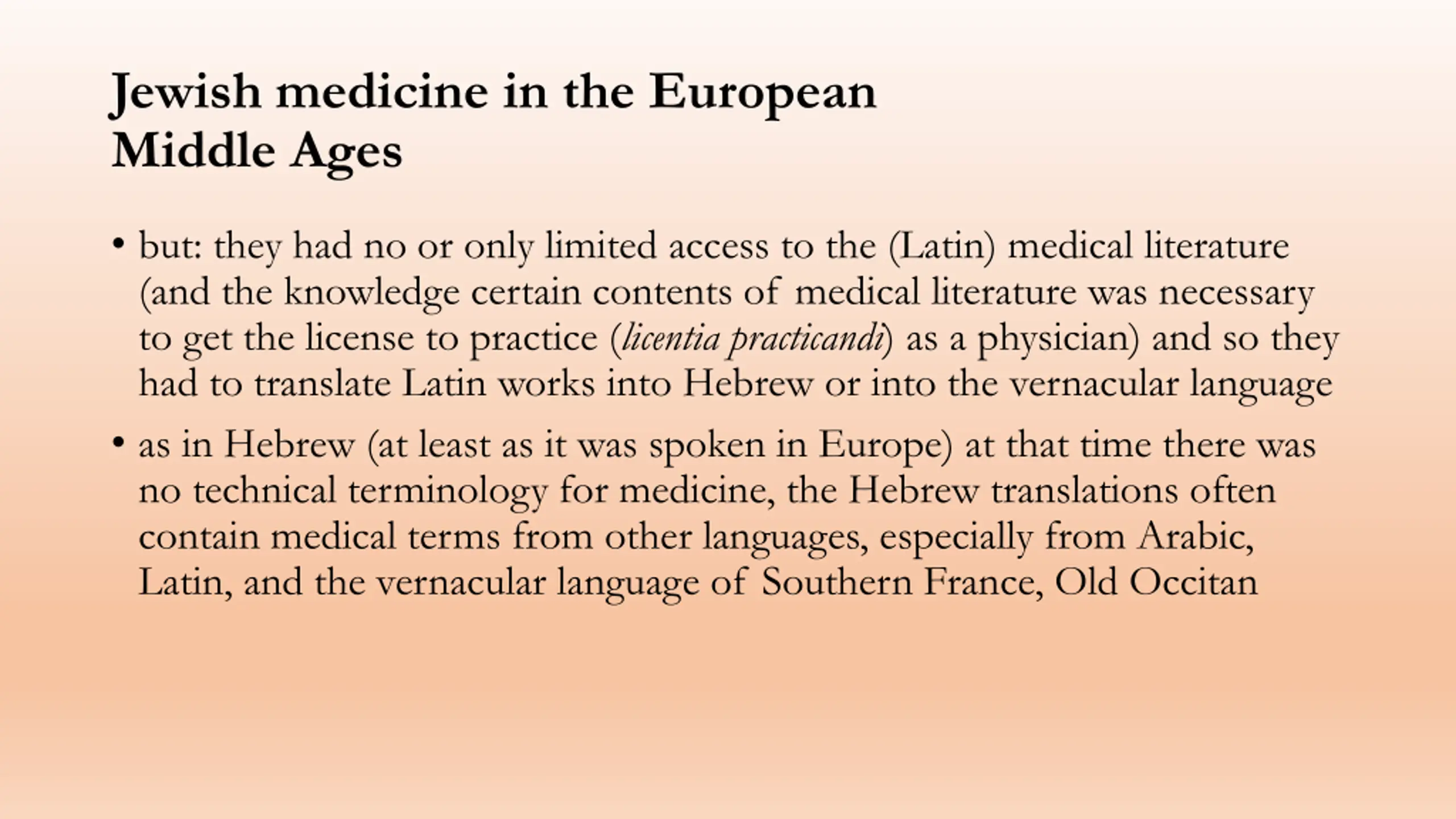 Jewish medicine in the European Middle Ages but: they had no or only limited access to the (Latin) medical literature (and the knowledge certain contents of medical literature was necessary to get the license to practice (licentia practicandi) as a physician) and so they had to translate Latin works into Hebrew or into the vernacular language as in Hebrew (at least as it was spoken in Europe) at that time there was no technical terminology for medicine, the Hebrew translations often contain medical terms from other languages, especially from Arabic, Latin, and the vernacular language of Southern France, Old Occitan
