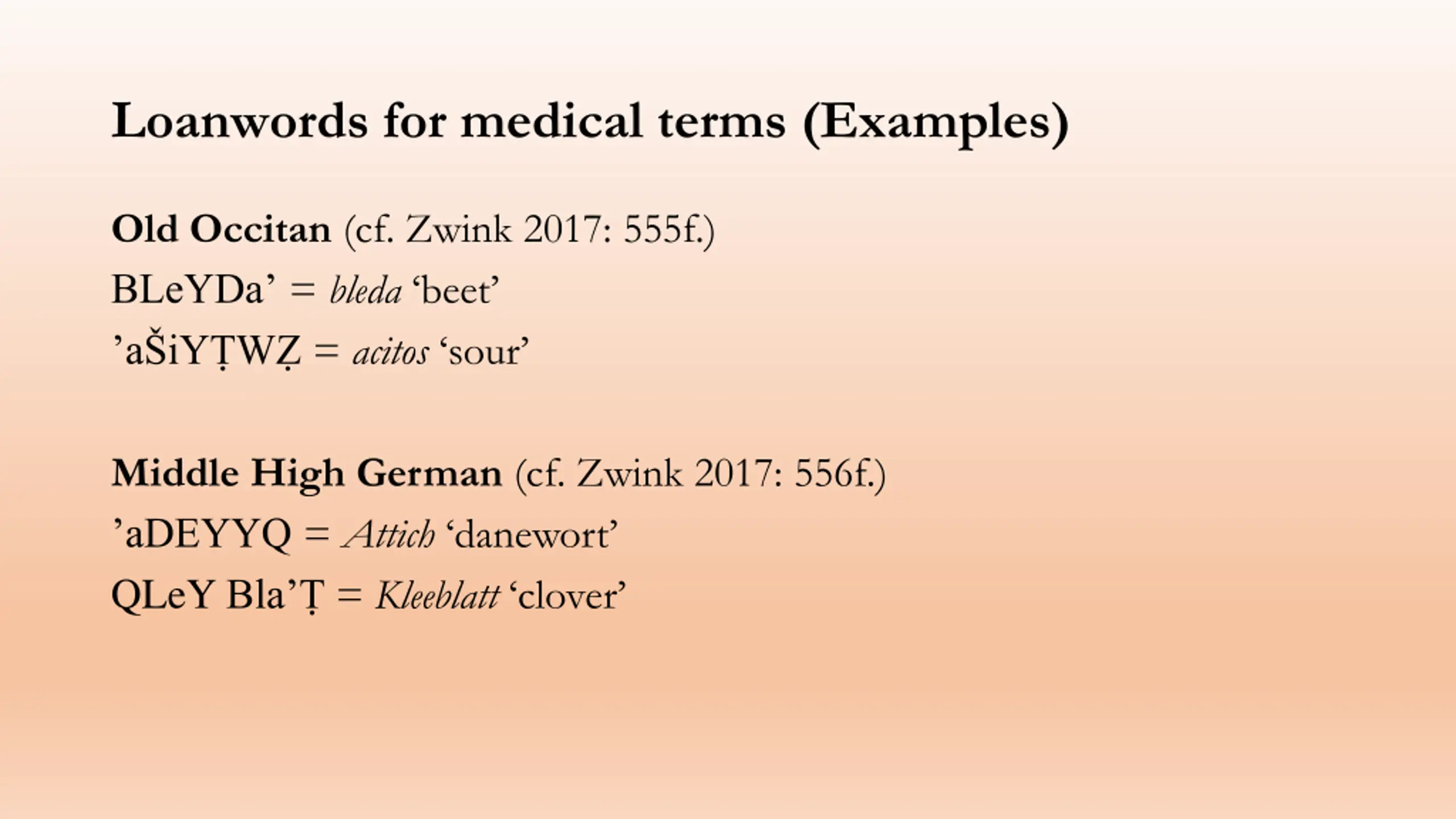 Loanwords for medical terms (Examples) Old Occitan (cf. Zwink 2017: 555f.) BLeYDa = bleda beet a iY W = acitos sour Middle High German (cf. Zwink 2017: 556f.) aDEYYQ = Attich danewort QLeY Bla = Kleeblatt clover