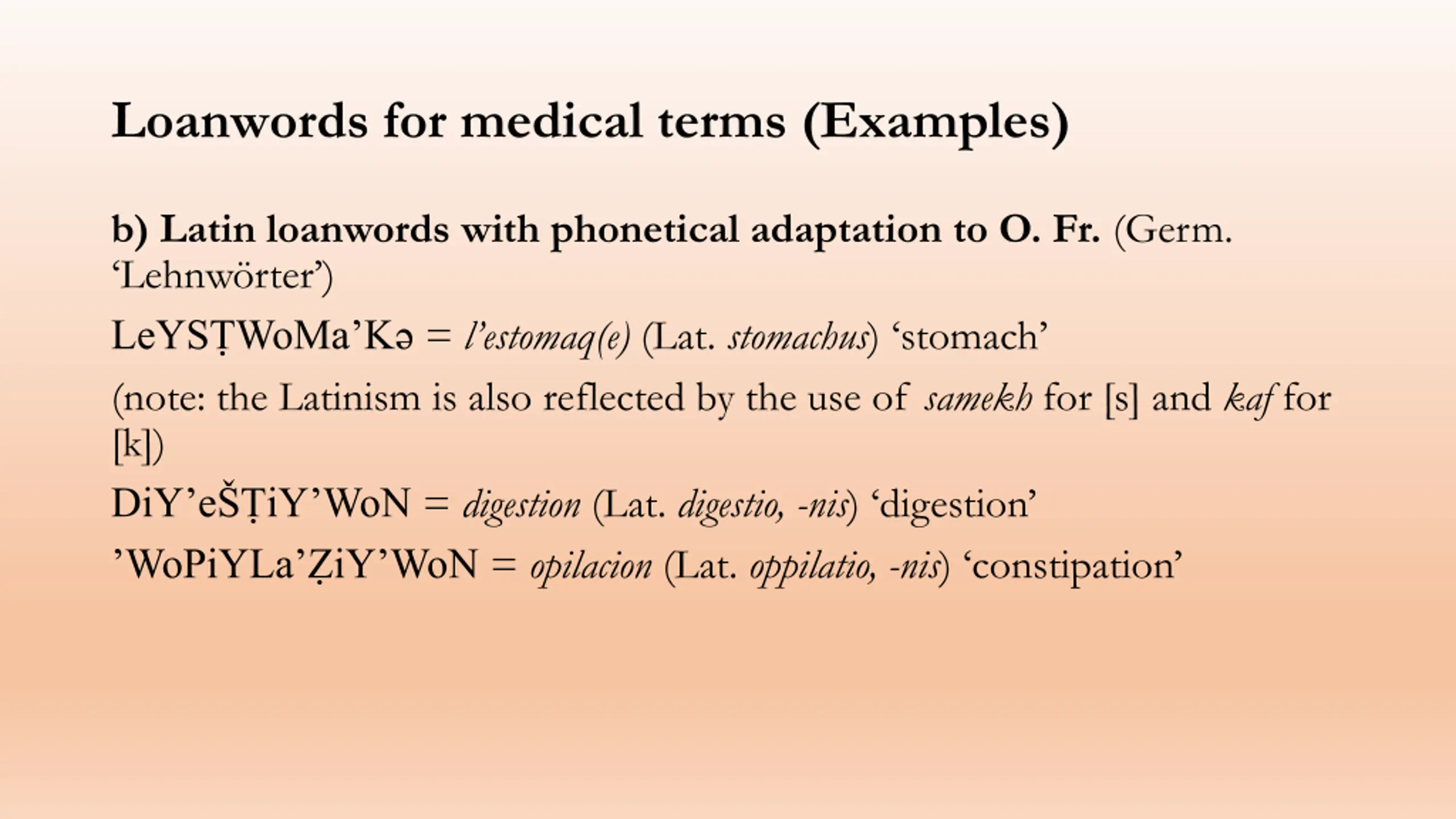 Loanwords for medical terms (Examples) b) Latin loanwords with phonetical adaptation to O. Fr. (Germ. Lehnw rter ) LeYS WoMa K = l estomaq(e) (Lat. stomachus) stomach (note: the Latinism is also reflected by the use of samekh for [s] and kaf for [k]) DiY e iY WoN = digestion (Lat. digestio, -nis) digestion WoPiYLa iY WoN = opilacion (Lat. oppilatio, -nis) constipation