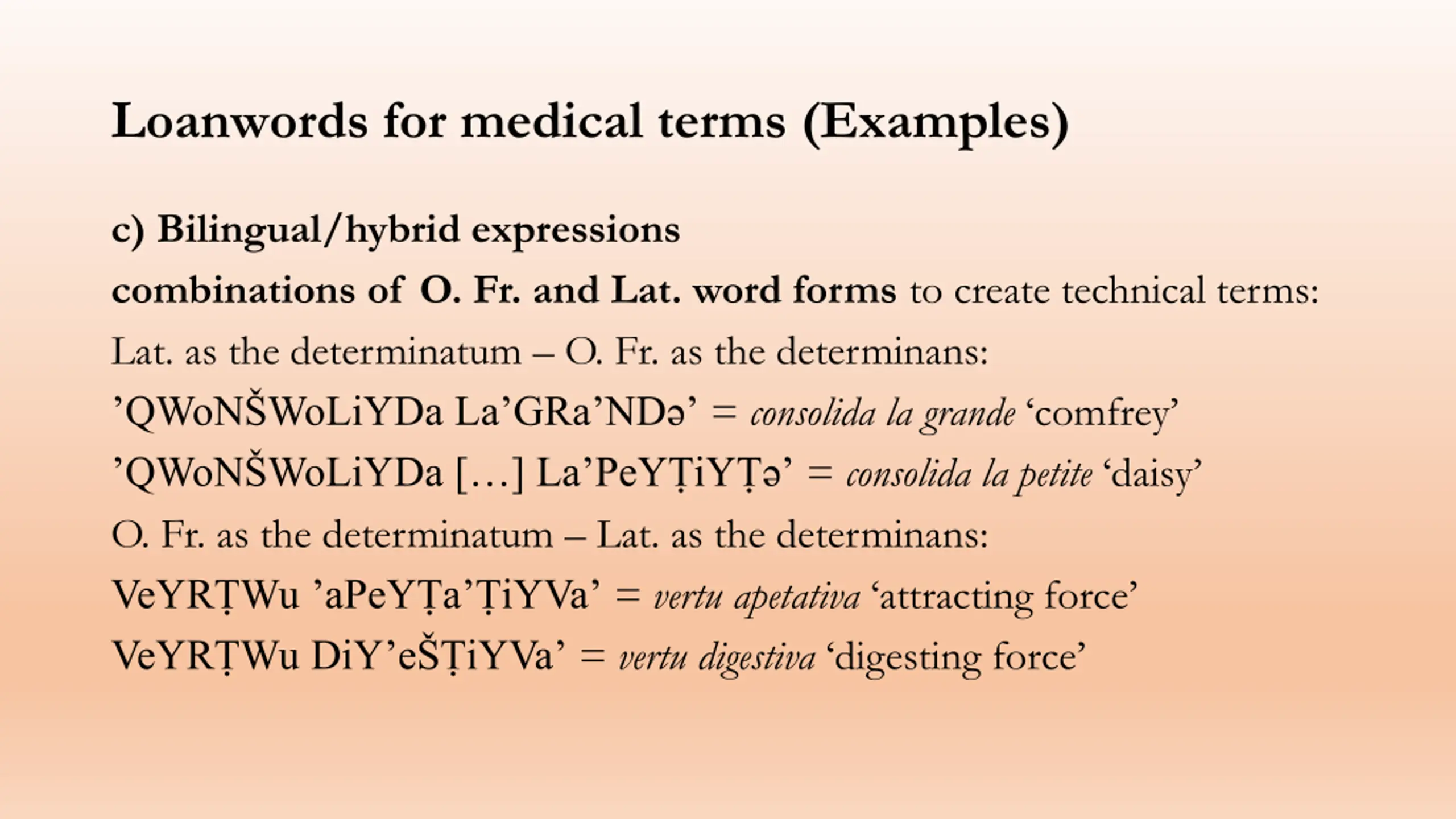 Loanwords for medical terms (Examples) c) Bilingual/hybrid expressions combinations of O. Fr. and Lat. word forms to create technical terms: Lat. as the determinatum O. Fr. as the determinans: QWoN WoLiYDa La GRa ND = consolida la grande comfrey QWoN WoLiYDa [ ] La PeY iY = consolida la petite daisy O. Fr. as the determinatum Lat. as the determinans: VeYR Wu aPeY a iYVa = vertu apetativa attracting force VeYR Wu DiY e iYVa = vertu digestiva digesting force