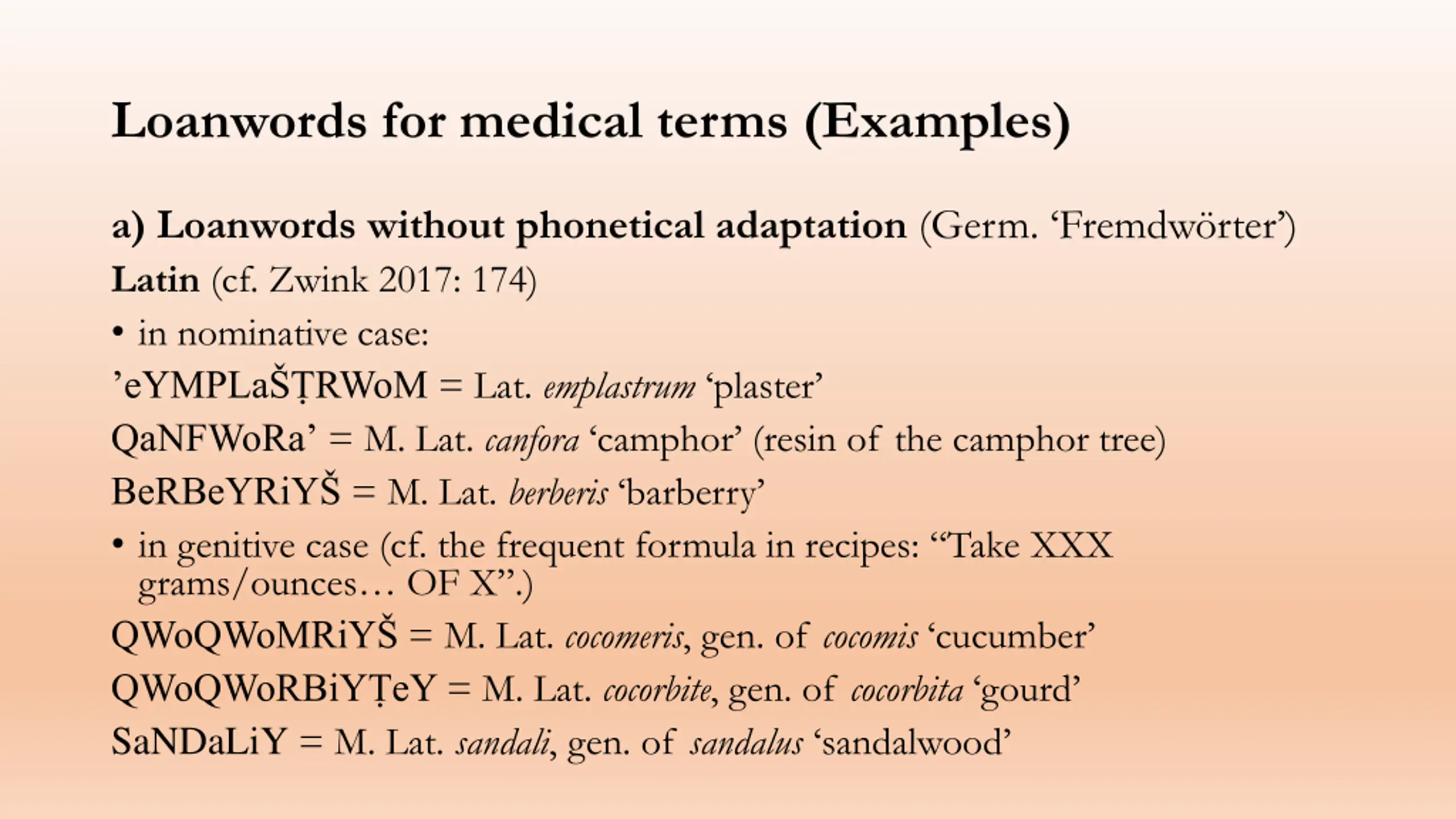 Loanwords for medical terms (Examples) a) Loanwords without phonetical adaptation (Germ. Fremdw rter ) Latin (cf. Zwink 2017: 174) in nominative case: eYMPLa RWoM = Lat. emplastrum plaster QaNFWoRa = M. Lat. canfora camphor (resin of the camphor tree) BeRBeYRiY = M. Lat. berberis barberry in genitive case (cf. the frequent formula in recipes: Take XXX grams/ounces OF X .) QWoQWoMRiY = M. Lat. cocomeris, gen. of cocomis cucumber QWoQWoRBiY eY = M. Lat. cocorbite, gen. of cocorbita gourd SaNDaLiY = M. Lat. sandali, gen. of sandalus sandalwood