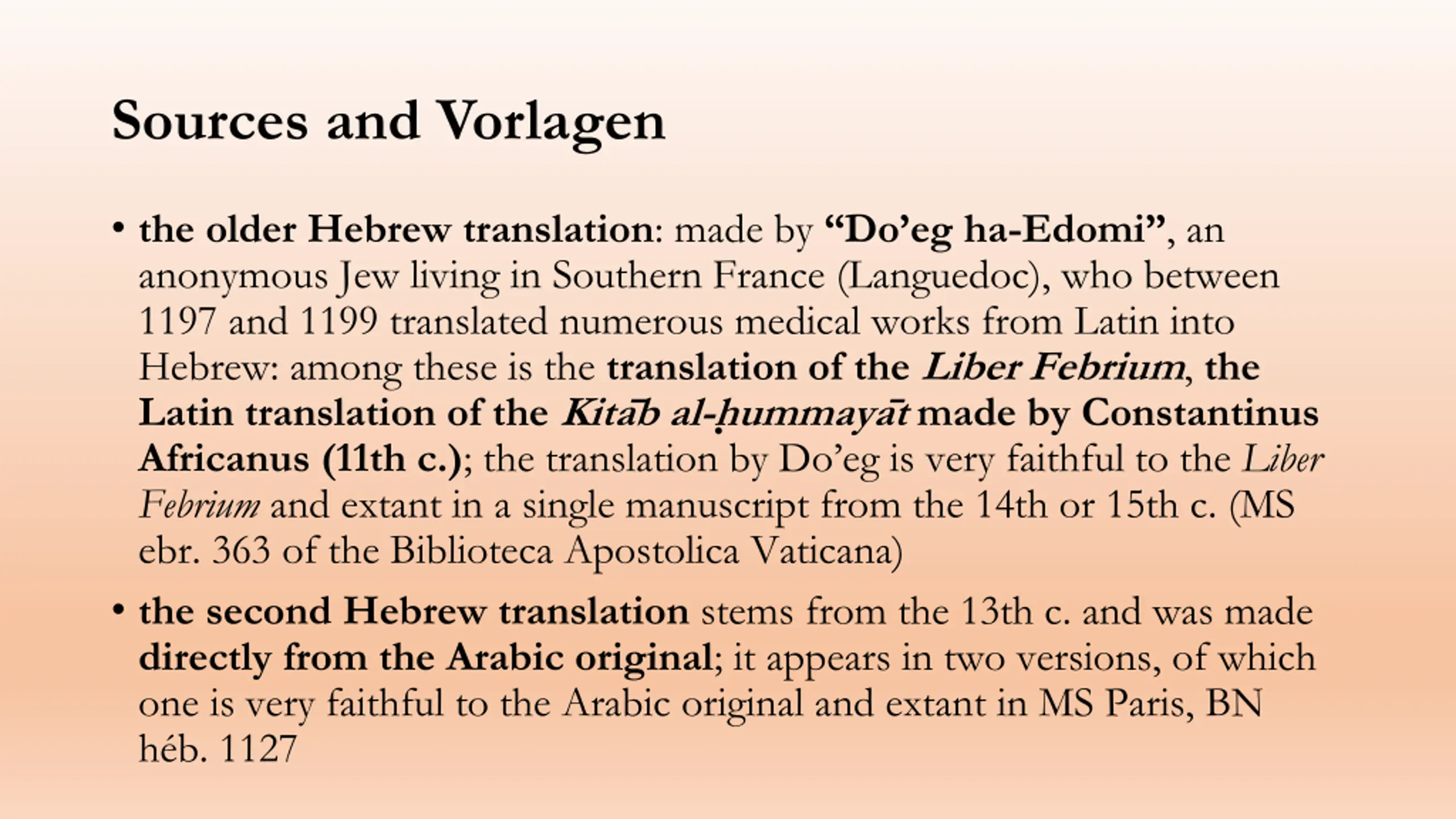 Sources and Vorlagen the older Hebrew translation: made by Do eg ha-Edomi , an anonymous Jew living in Southern France (Languedoc), who between 1197 and 1199 translated numerous medical works from Latin into Hebrew: among these is the translation of the Liber Febrium, the Latin translation of the Kita b al-h ummaya t made by Constantinus Africanus (11th c.); the translation by Do eg is very faithful to the Liber Febrium and extant in a single manuscript from the 14th or 15th c. (MS ebr. 363 of the Biblioteca Apostolica Vaticana) the second Hebrew translation stems from the 13th c. and was made directly from the Arabic original; it appears in two versions, of which one is very faithful to the Arabic original and extant in MS Paris, BN h b. 1127