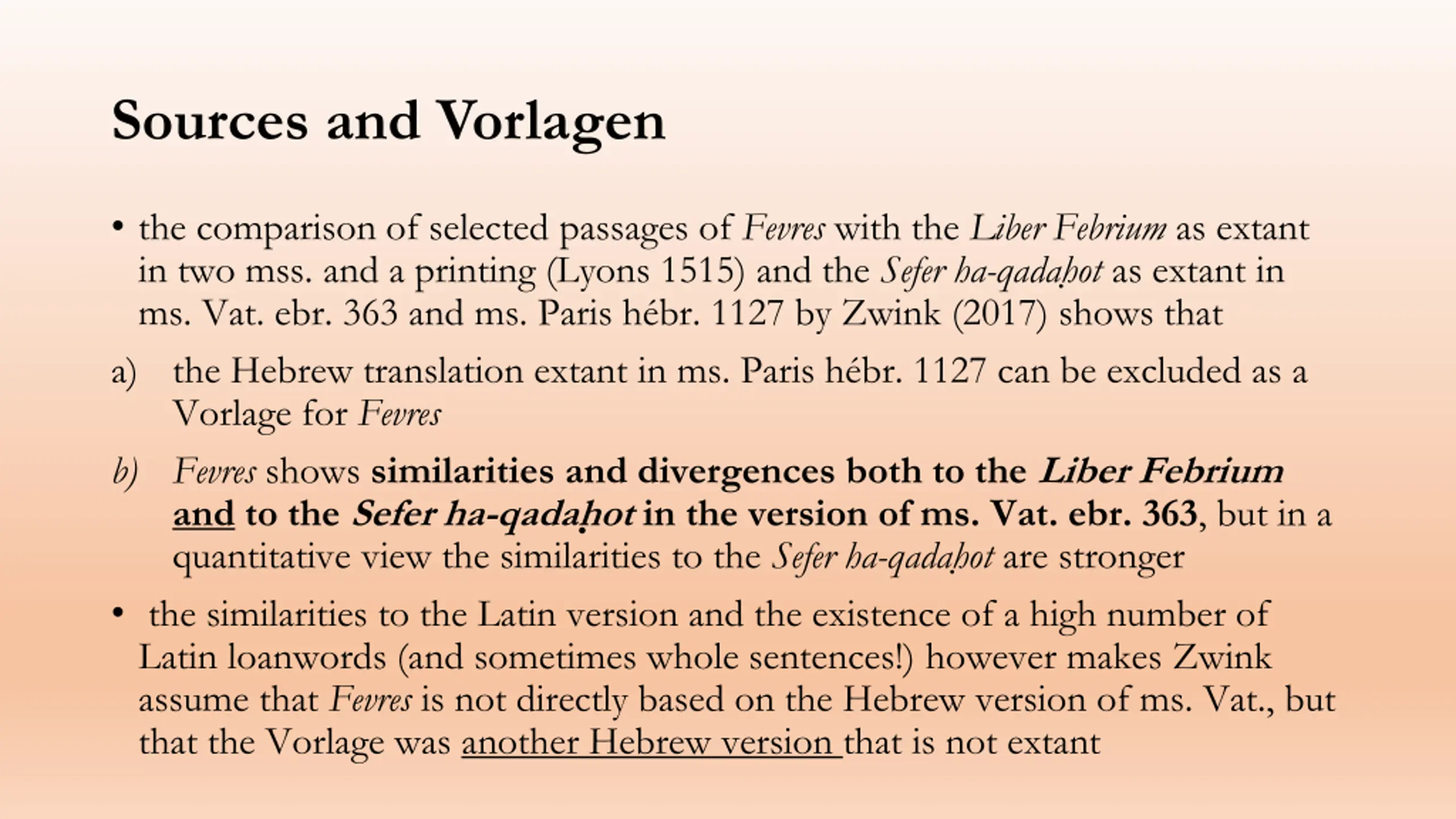 Sources and Vorlagen the comparison of selected passages of Fevres with the Liber Febrium as extant in two mss. and a printing (Lyons 1515) and the Sefer ha-qadah ot as extant in ms. Vat. ebr. 363 and ms. Paris h br. 1127 by Zwink (2017) shows that a) the Hebrew translation extant in ms. Paris h br. 1127 can be excluded as a Vorlage for Fevres b) Fevres shows similarities and divergences both to the Liber Febrium and to the Sefer ha-qadah ot in the version of ms. Vat. ebr. 363, but in a quantitative view the similarities to the Sefer ha-qadah ot are stronger the similarities to the Latin version and the existence of a high number of Latin loanwords (and sometimes whole sentences!) however makes Zwink assume that Fevres is not directly based on the Hebrew version of ms. Vat., but that the Vorlage was another Hebrew version that is not extant