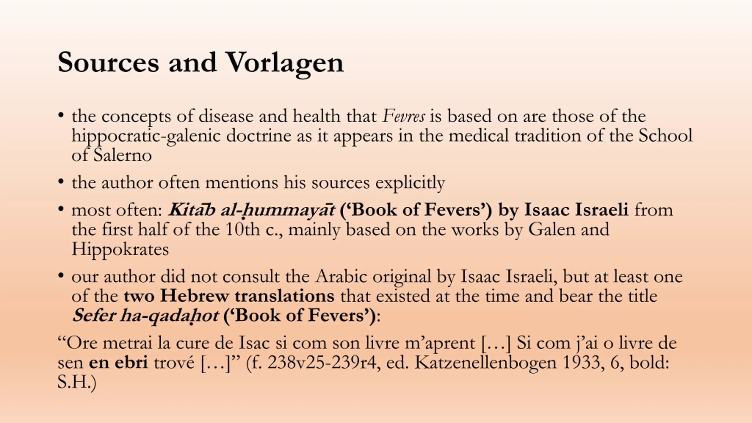 Sources and Vorlagen the concepts of disease and health that Fevres is based on are those of the hippocratic-galenic doctrine as it appears in the medical tradition of the School of Salerno the author often mentions his sources explicitly most often: Kita b al-h ummaya t ( Book of Fevers ) by Isaac Israeli from the first half of the 10th c., mainly based on the works by Galen and Hippokrates our author did not consult the Arabic original by Isaac Israeli, but at least one of the two Hebrew translations that existed at the time and bear the title Sefer ha-qadah ot ( Book of Fevers ): Ore metrai la cure de Isac si com son livre m aprent [ ] Si com j ai o livre de sen en ebri trov [ ] (f. 238v25-239r4, ed. Katzenellenbogen 1933, 6, bold: S.H.)