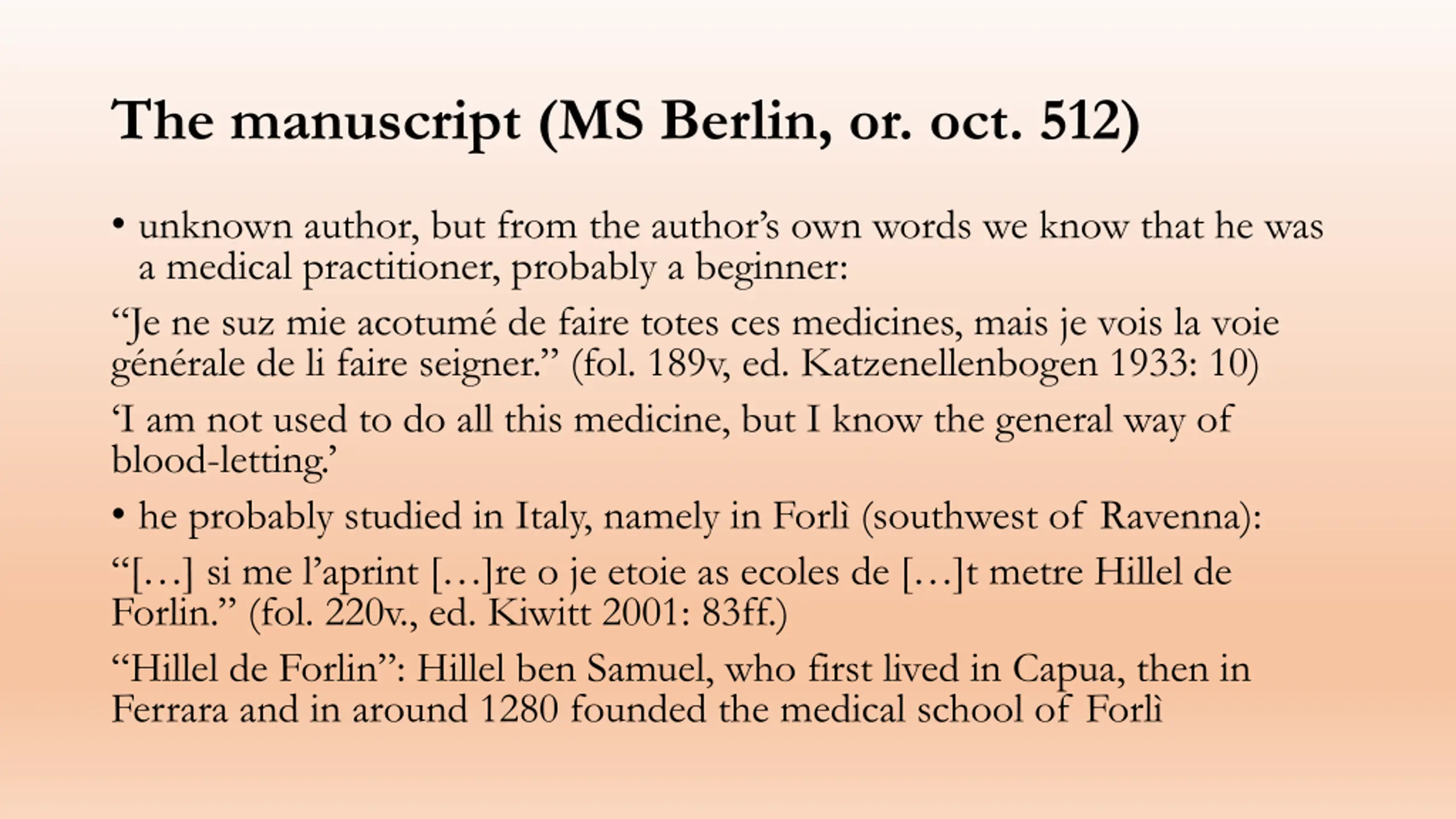 The manuscript (MS Berlin, or. oct. 512) unknown author, but from the author s own words we know that he was a medical practitioner, probably a beginner: Je ne suz mie acotum de faire totes ces medicines, mais je vois la voie g n rale de li faire seigner. (fol. 189v, ed. Katzenellenbogen 1933: 10) I am not used to do all this medicine, but I know the general way of blood-letting. he probably studied in Italy, namely in Forl (southwest of Ravenna): [ ] si me l aprint [ ]re o je etoie as ecoles de [ ]t metre Hillel de Forlin. (fol. 220v., ed. Kiwitt 2001: 83ff.) Hillel de Forlin : Hillel ben Samuel, who first lived in Capua, then in Ferrara and in around 1280 founded the medical school of Forl