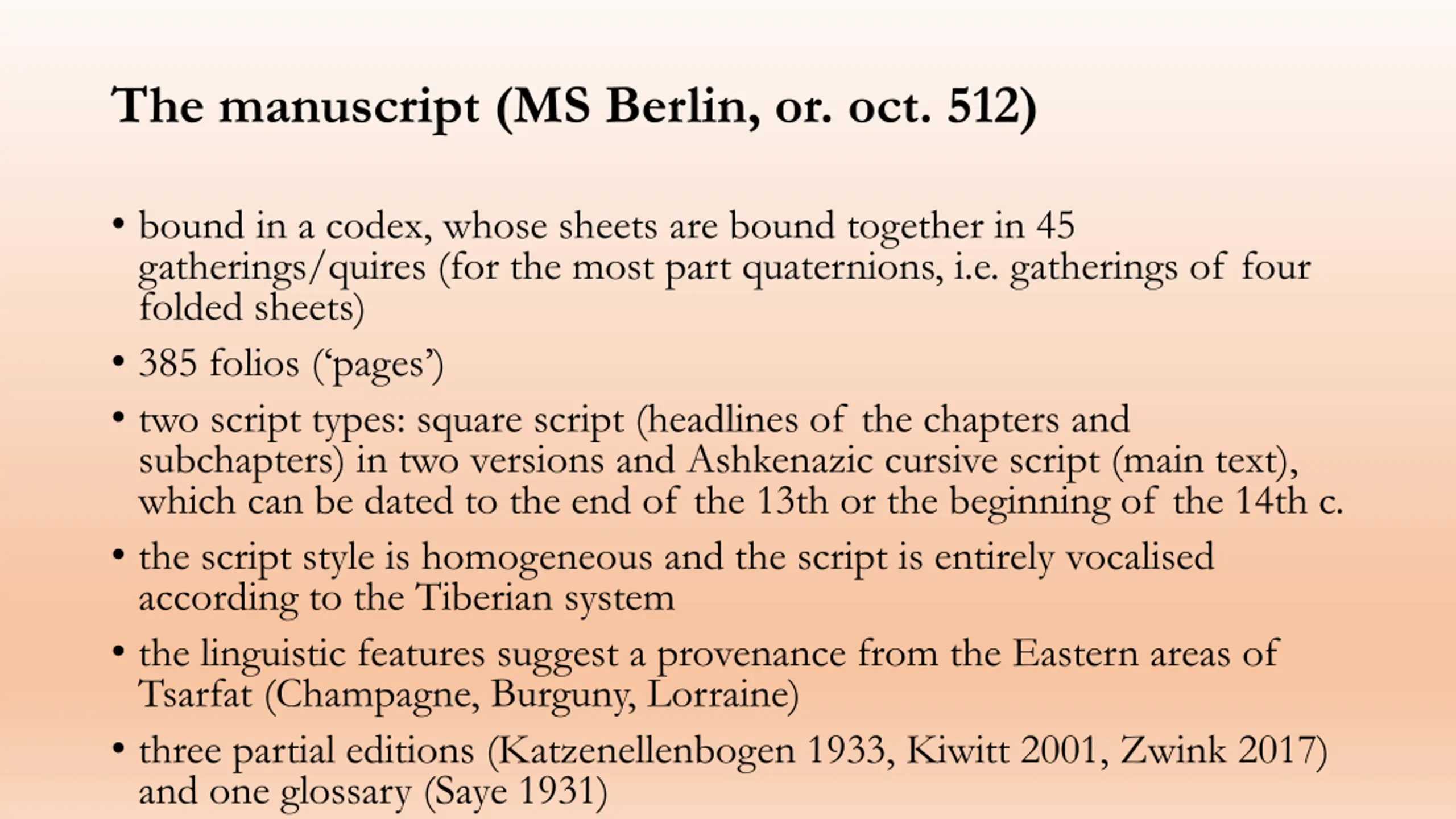 The manuscript (MS Berlin, or. oct. 512) bound in a codex, whose sheets are bound together in 45 gatherings/quires (for the most part quaternions, i.e. gatherings of four folded sheets) 385 folios ( pages ) two script types: square script (headlines of the chapters and subchapters) in two versions and Ashkenazic cursive script (main text), which can be dated to the end of the 13th or the beginning of the 14th c. the script style is homogeneous and the script is entirely vocalised according to the Tiberian system the linguistic features suggest a provenance from the Eastern areas of Tsarfat (Champagne, Burguny, Lorraine) three partial editions (Katzenellenbogen 1933, Kiwitt 2001, Zwink 2017) and one glossary (Saye 1931)