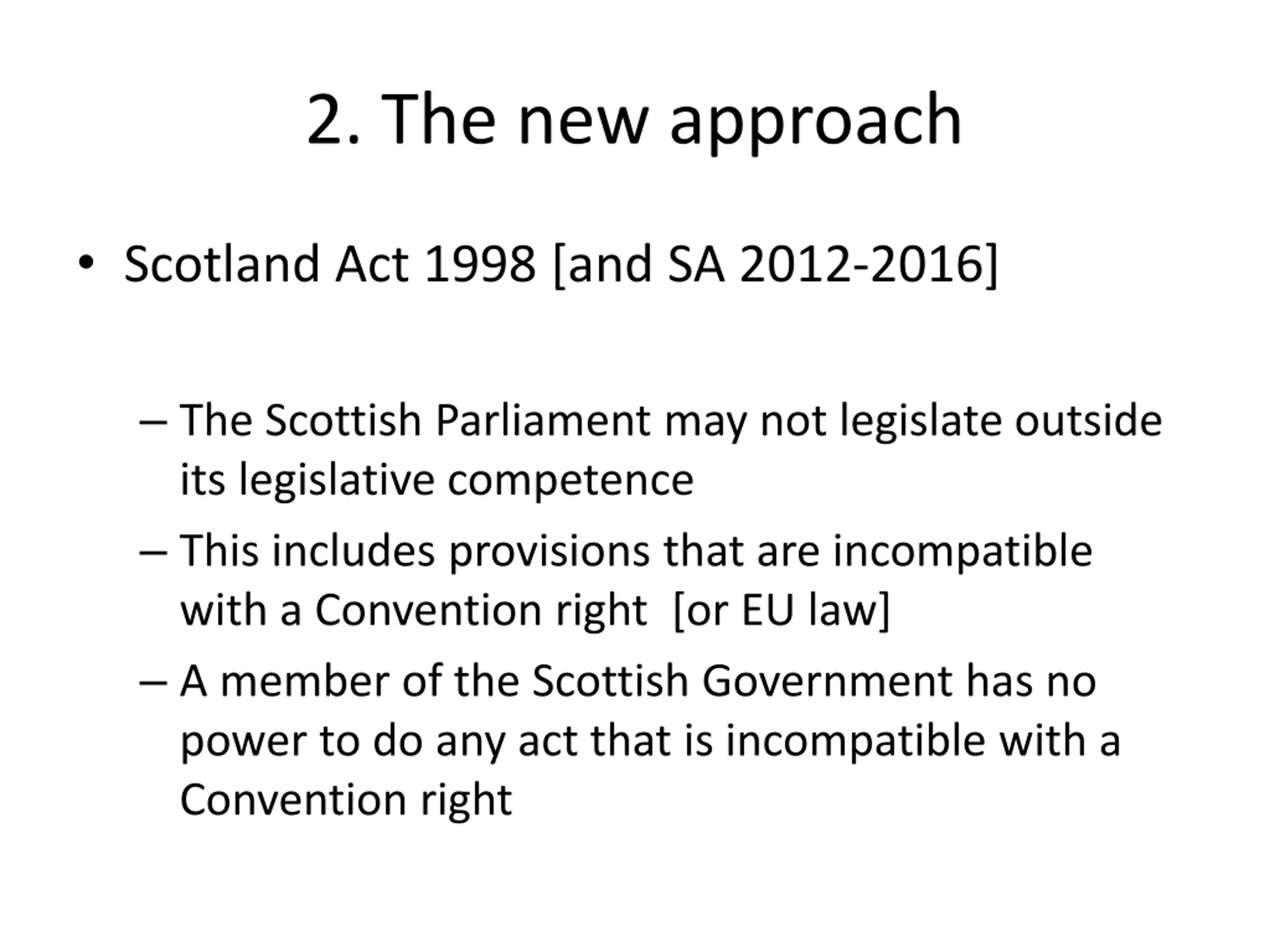 2. The new approach Scotland Act 1998 [and SA 2012-2016] The Scottish Parliament may not legislate outside its legislative competence This includes provisions that are incompatible with a Convention right [or EU law] A member of the Scottish Government has no power to do any act that is incompatible with a Convention right