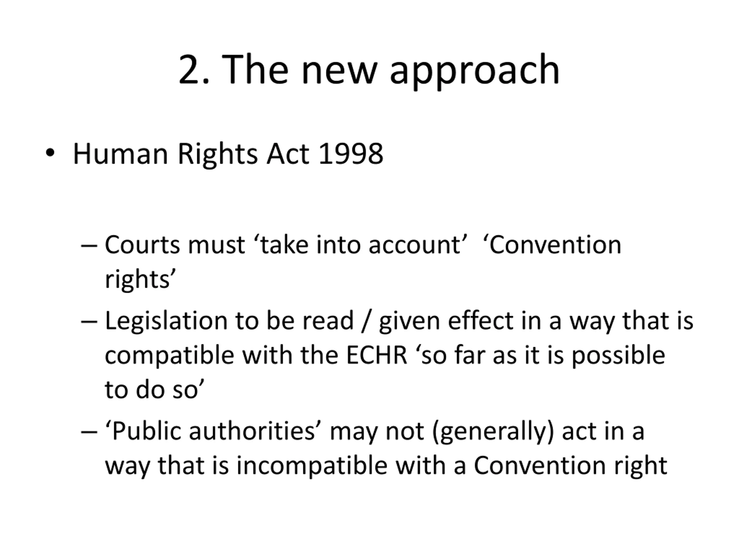 2. The new approach Human Rights Act 1998 Courts must take into account Convention rights Legislation to be read / given effect in a way that is compatible with the ECHR so far as it is possible to do so Public authorities may not (generally) act in a way that is incompatible with a Convention right