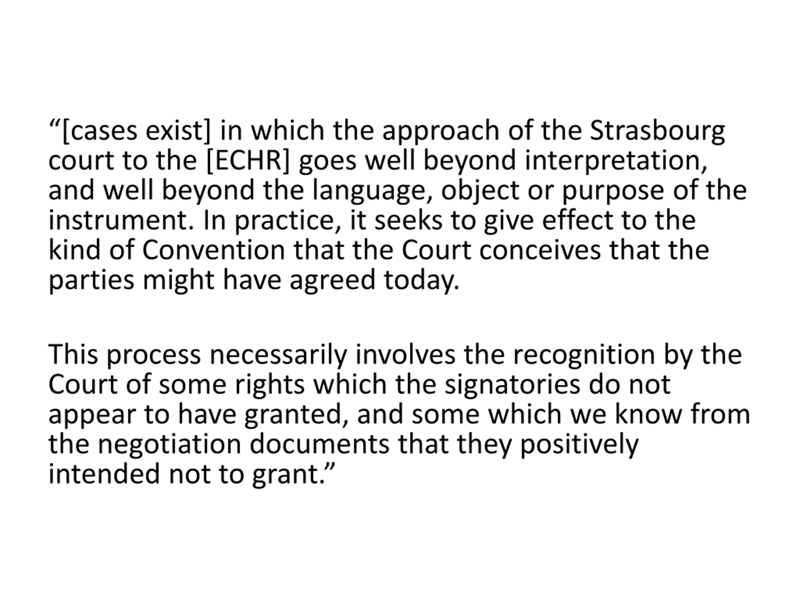[cases exist] in which the approach of the Strasbourg court to the [ECHR] goes well beyond interpretation, and well beyond the language, object or purpose of the instrument. In practice, it seeks to give effect to the kind of Convention that the Court conceives that the parties might have agreed today. This process necessarily involves the recognition by the Court of some rights which the signatories do not appear to have granted, and some which we know from the negotiation documents that they positively intended not to grant.