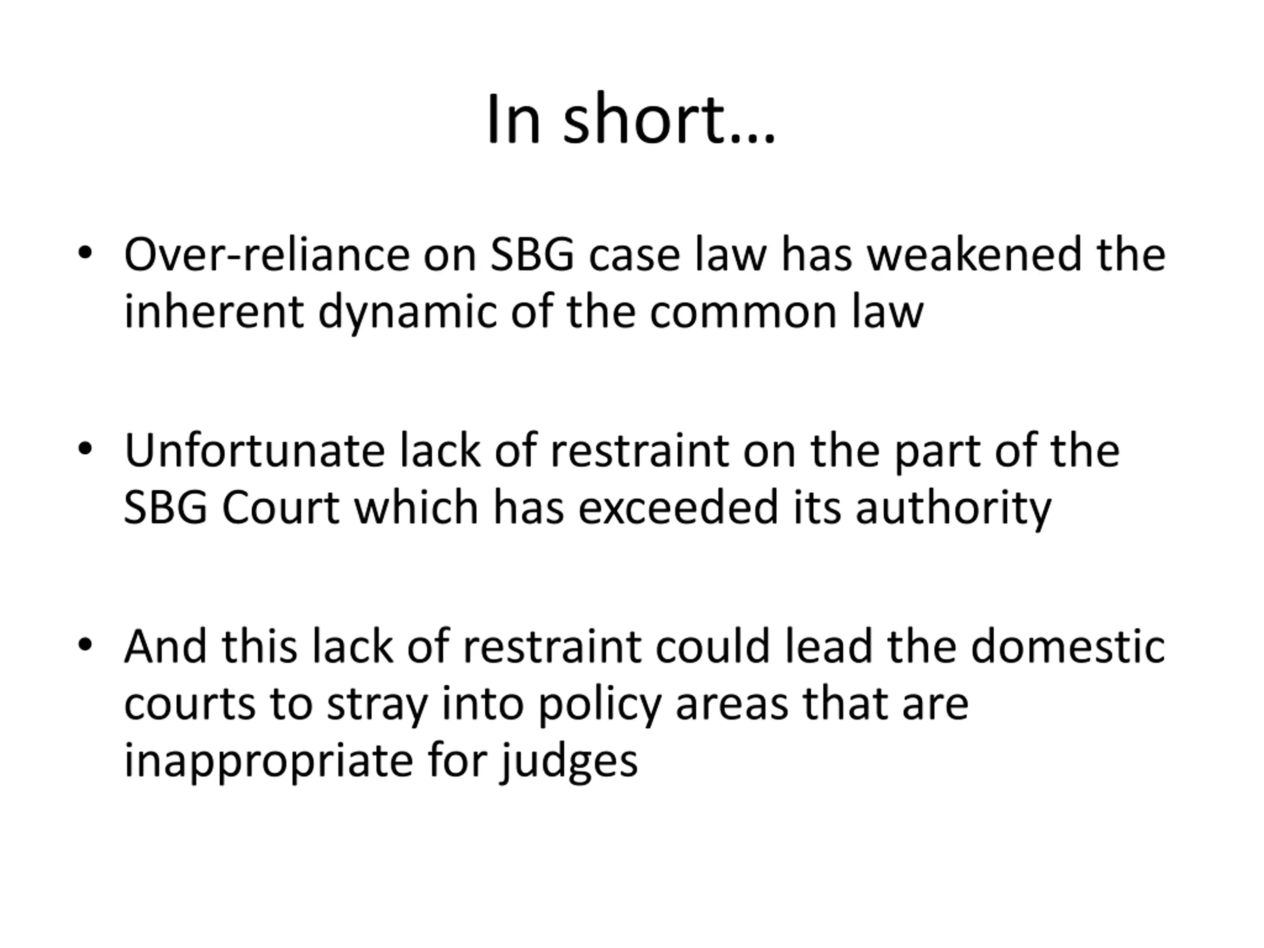 In short Over-reliance on SBG case law has weakened the inherent dynamic of the common law Unfortunate lack of restraint on the part of the SBG Court which has exceeded its authority And this lack of restraint could lead the domestic courts to stray into policy areas that are inappropriate for judges