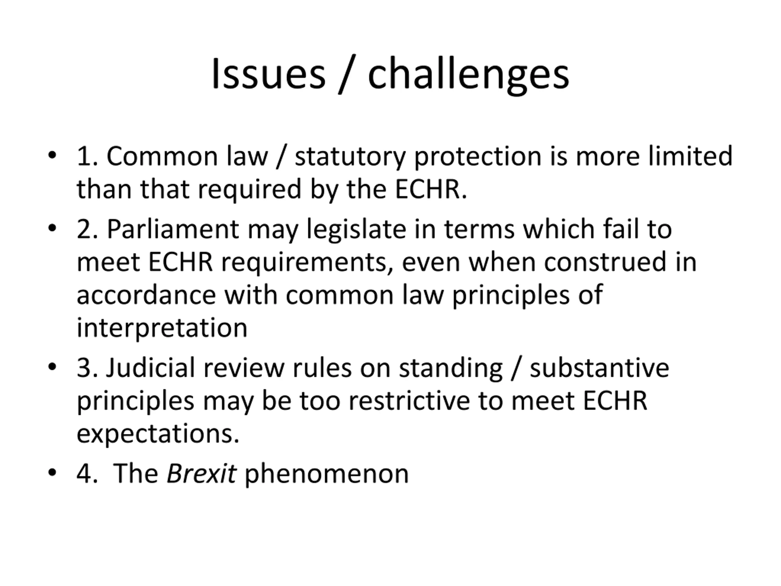 Issues / challenges 1. Common law / statutory protection is more limited than that required by the ECHR. 2. Parliament may legislate in terms which fail to meet ECHR requirements, even when construed in accordance with common law principles of interpretation 3. Judicial review rules on standing / substantive principles may be too restrictive to meet ECHR expectations. 4. The Brexit phenomenon