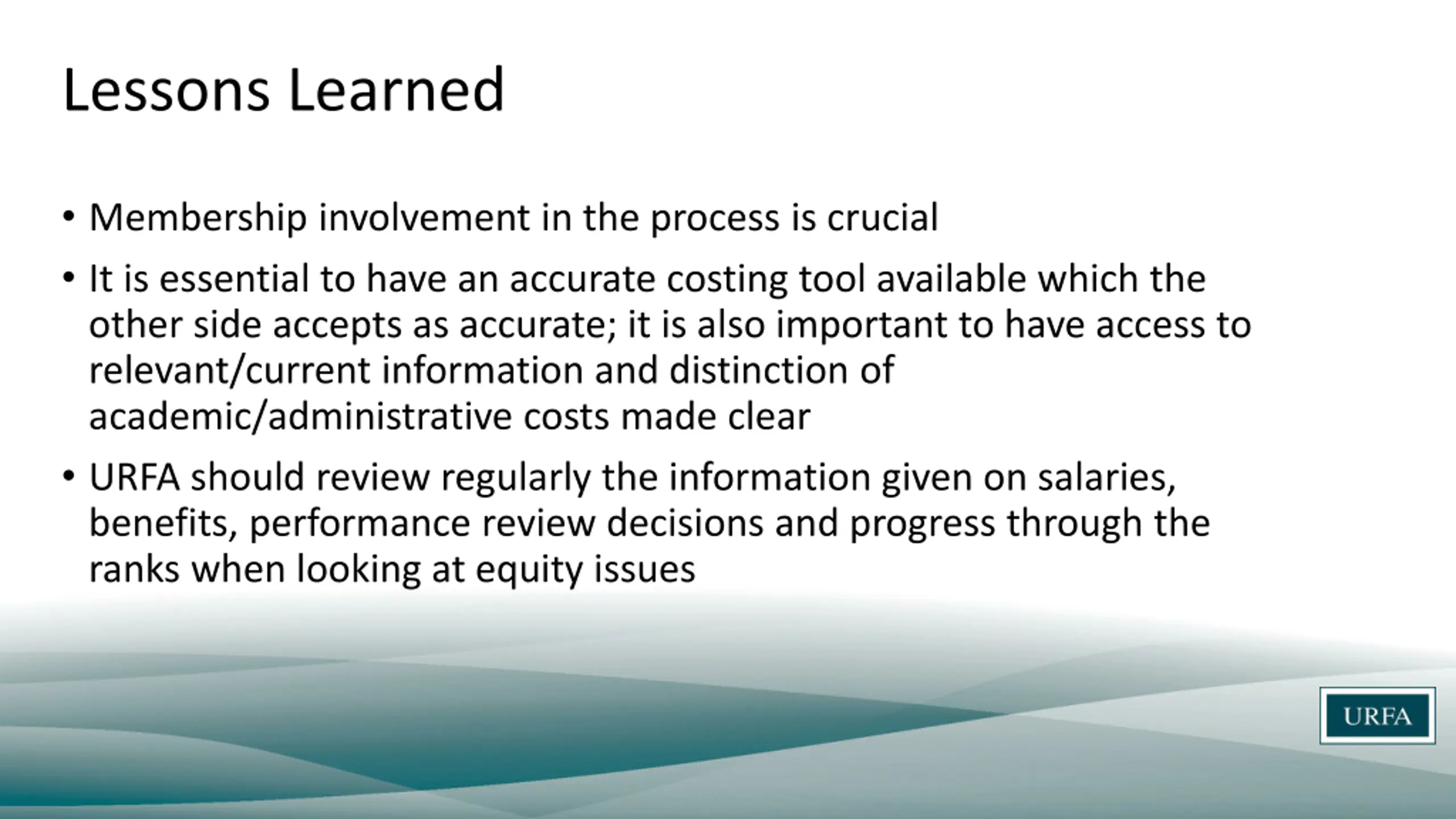 Lessons Learned Membership involvement in the process is crucial It is essential to have an accurate costing tool available which the other side accepts as accurate; it is also important to have access to relevant/current information and distinction of academic/administrative costs made clear URFA should review regularly the information given on salaries, benefits, performance review decisions and progress through the ranks when looking at equity issues