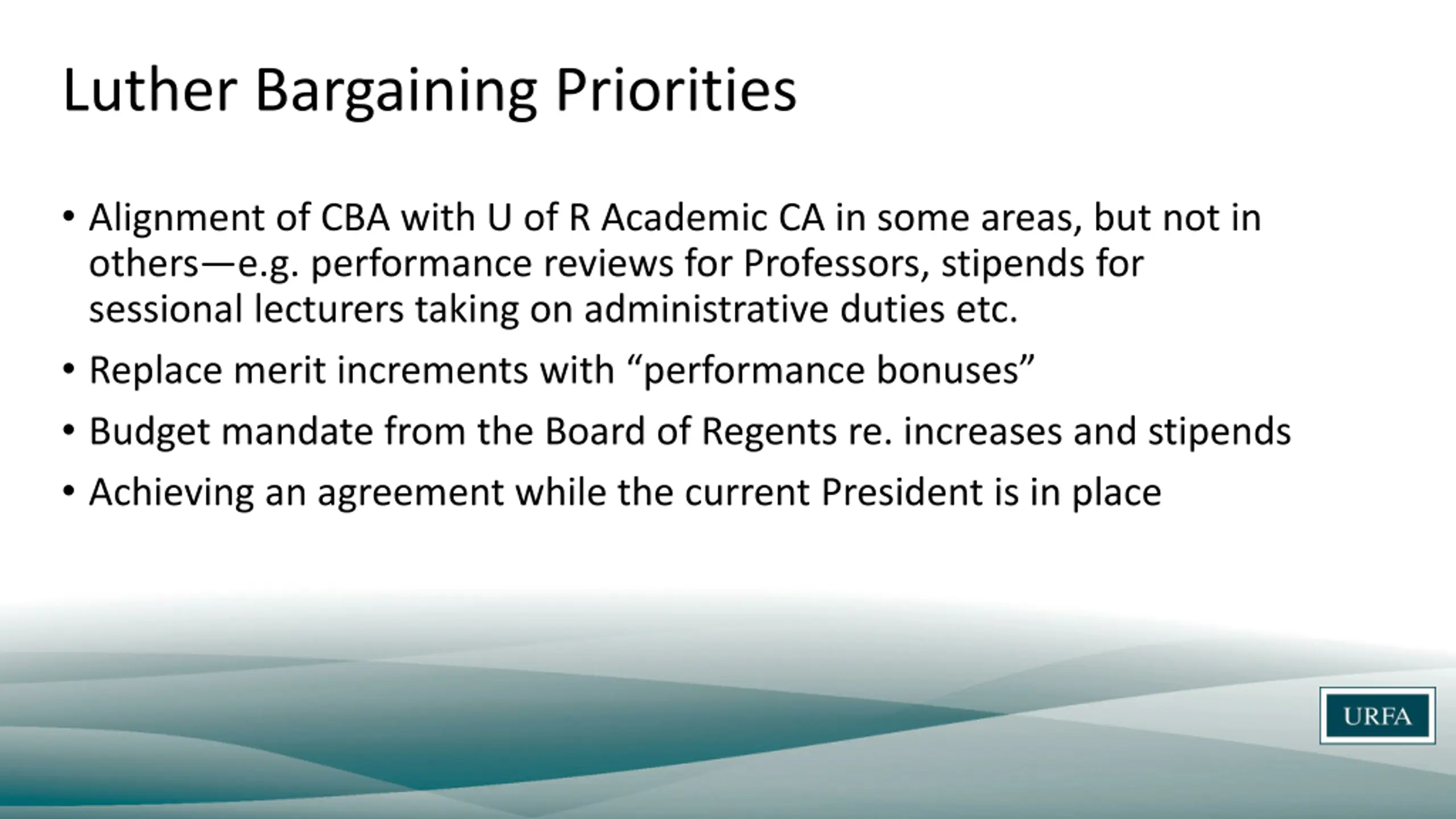 Luther Bargaining Priorities Alignment of CBA with U of R Academic CA in some areas, but not in others e.g. performance reviews for Professors, stipends for sessional lecturers taking on administrative duties etc. Replace merit increments with performance bonuses Budget mandate from the Board of Regents re. increases and stipends Achieving an agreement while the current President is in place