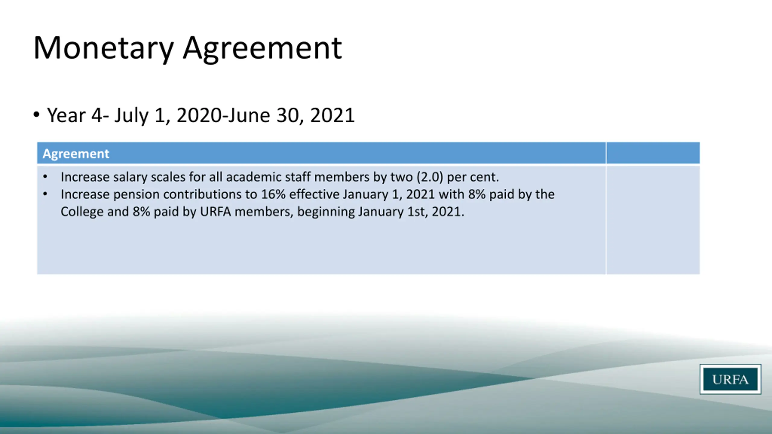 Monetary Agreement Year 4- July 1, 2020-June 30, 2021 Agreement Increase salary scales for all academic staff members by two (2.0) per cent. Increase pension contributions to 16% effective January 1, 2021 with 8% paid by the College and 8% paid by URFA members, beginning January 1st, 2021.