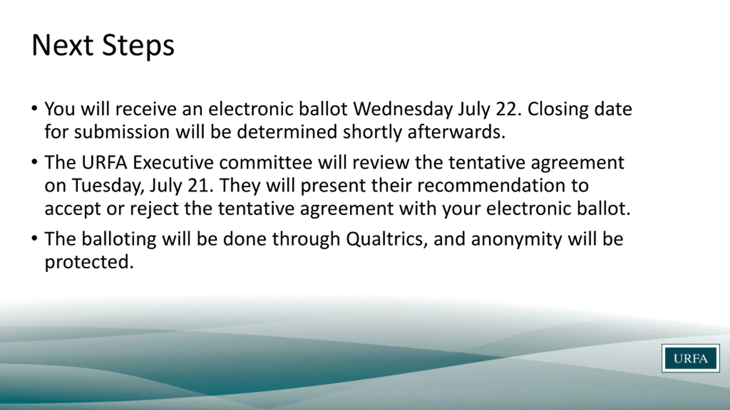 Next Steps You will receive an electronic ballot Wednesday July 22. Closing date for submission will be determined shortly afterwards. The URFA Executive committee will review the tentative agreement on Tuesday, July 21. They will present their recommendation to accept or reject the tentative agreement with your electronic ballot. The balloting will be done through Qualtrics, and anonymity will be protected.