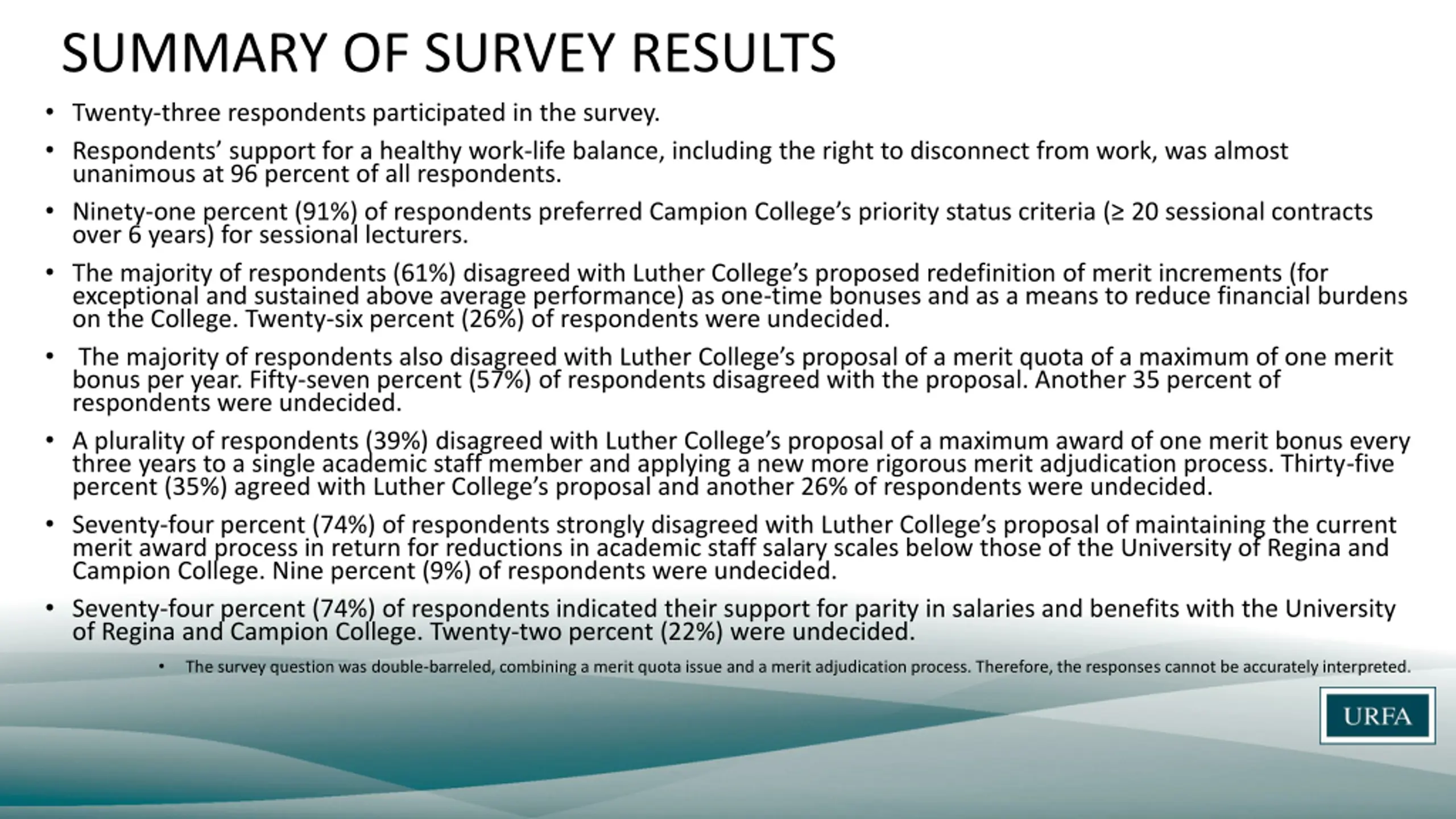SUMMARY OF SURVEY RESULTS Twenty-three respondents participated in the survey. Respondents support for a healthy work-life balance, including the right to disconnect from work, was almost unanimous at 96 percent of all respondents. Ninety-one percent (91%) of respondents preferred Campion College s priority status criteria ( 20 sessional contracts over 6 years) for sessional lecturers. The majority of respondents (61%) disagreed with Luther College s proposed redefinition of merit increments (for exceptional and sustained above average performance) as one-time bonuses and as a means to reduce financial burdens on the College. Twenty-six percent (26%) of respondents were undecided. The majority of respondents also disagreed with Luther College s proposal of a merit quota of a maximum of one merit bonus per year. Fifty-seven percent (57%) of respondents disagreed with the proposal. Another 35 percent of respondents were undecided. A plurality of respondents (39%) disagreed with Luther College s proposal of a maximum award of one merit bonus every three years to a single academic staff member and applying a new more rigorous merit adjudication process. Thirty-five percent (35%) agreed with Luther College s proposal and another 26% of respondents were undecided. Seventy-four percent (74%) of respondents strongly disagreed with Luther College s proposal of maintaining the current merit award process in return for reductions in academic staff salary scales below those of the University of Regina and Campion College. Nine percent (9%) of respondents were undecided. Seventy-four percent (74%) of respondents indicated their support for parity in salaries and benefits with the University of Regina and Campion College. Twenty-two percent (22%) were undecided. The survey question was double-barreled, combining a merit quota issue and a merit adjudication process. Therefore, the responses cannot be accurately interpreted.