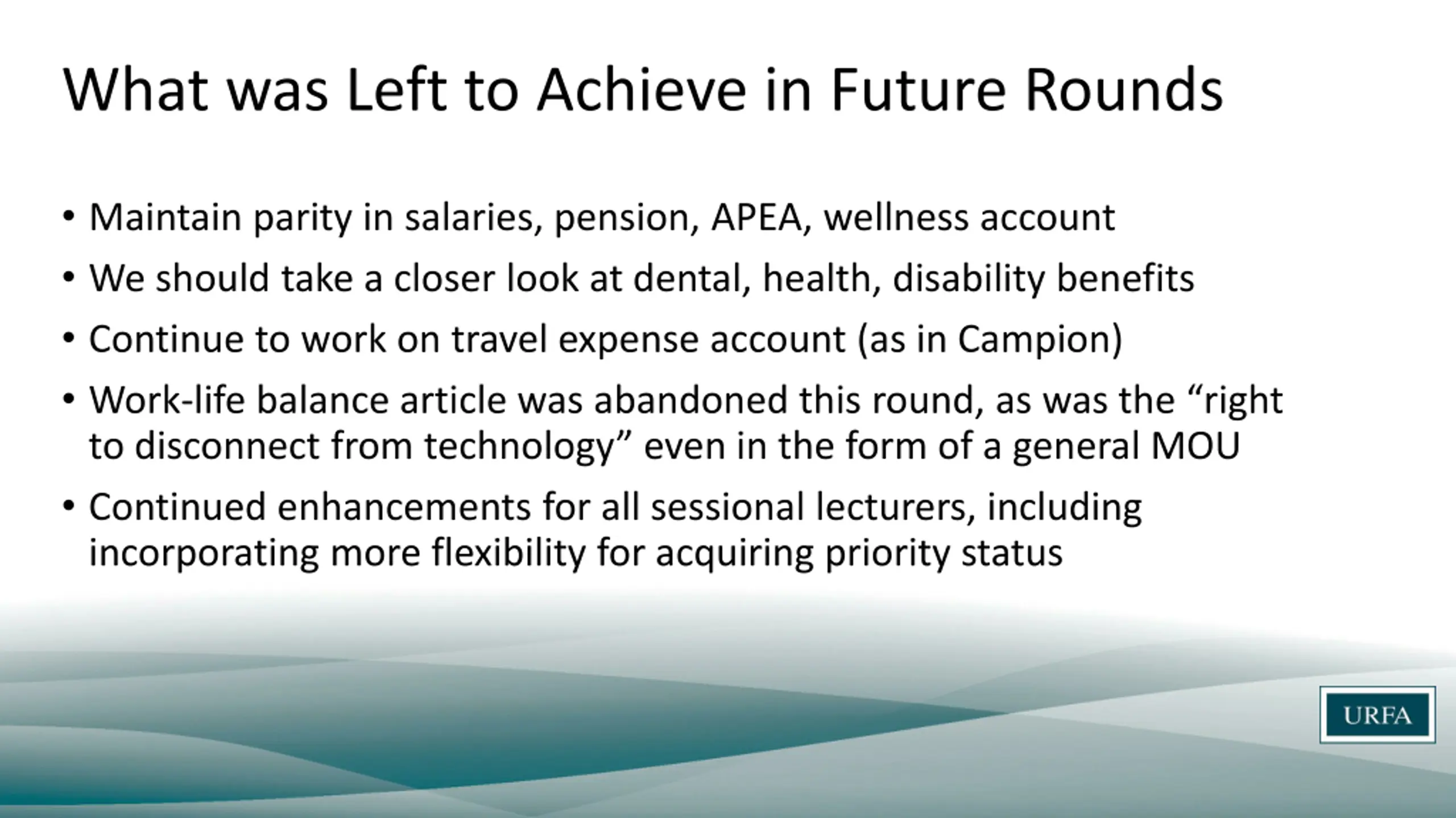 What was Left to Achieve in Future Rounds Maintain parity in salaries, pension, APEA, wellness account We should take a closer look at dental, health, disability benefits Continue to work on travel expense account (as in Campion) Work-life balance article was abandoned this round, as was the right to disconnect from technology even in the form of a general MOU Continued enhancements for all sessional lecturers, including incorporating more flexibility for acquiring priority status