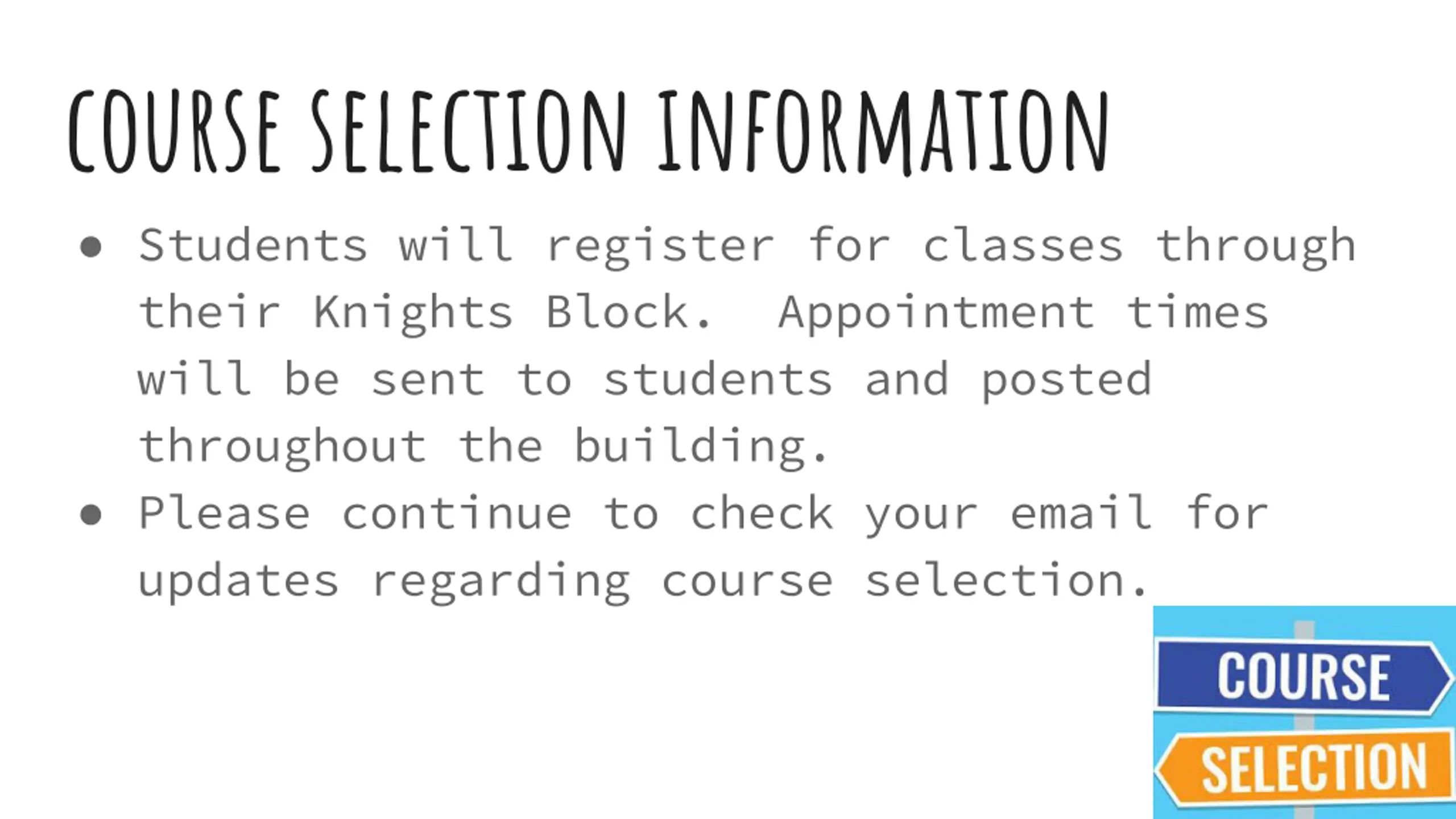 course selection information Students will register for classes through their Knights Block. Appointment times will be sent to students and posted throughout the building. Please continue to check your email for updates regarding course selection.