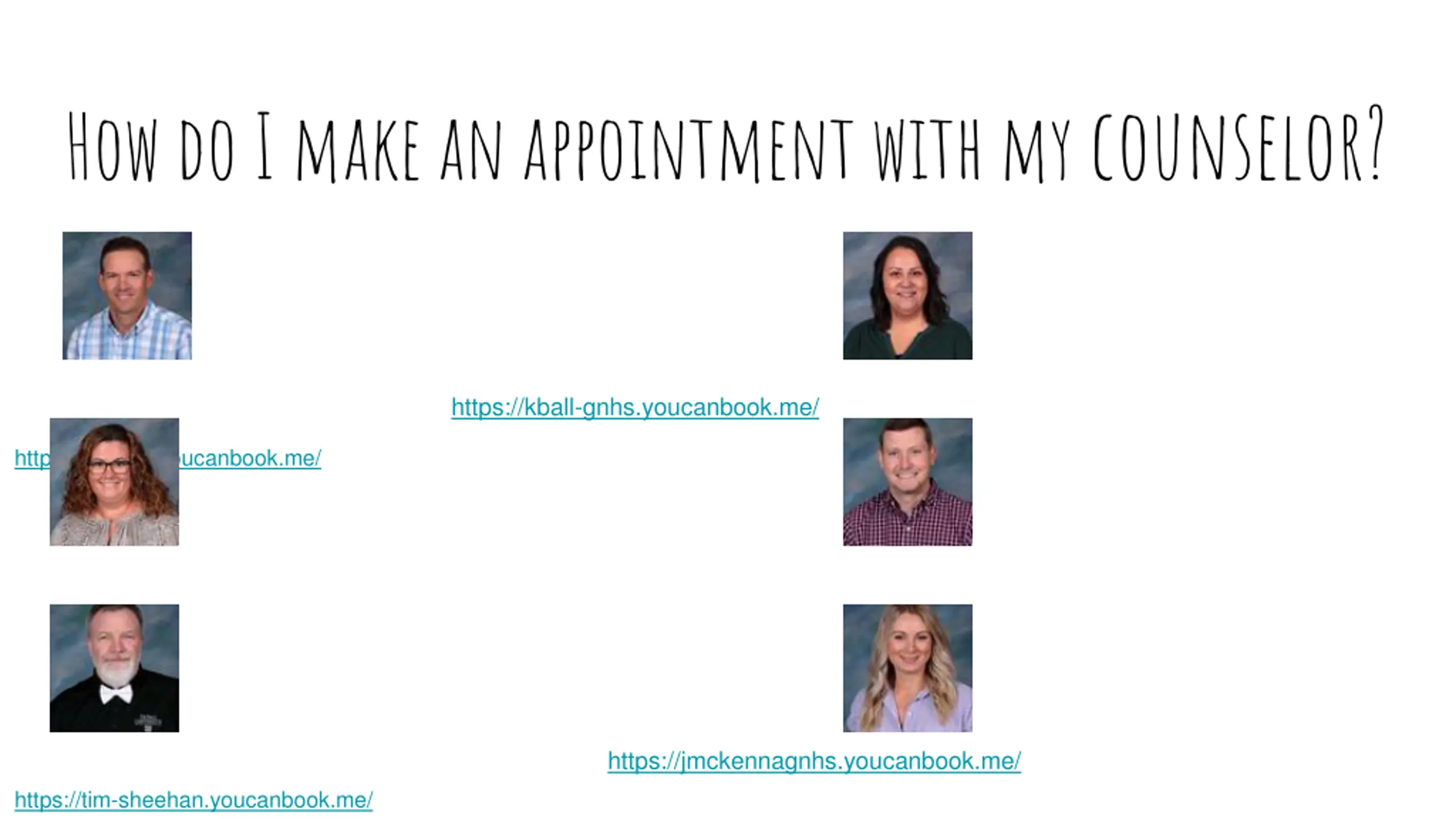 How do I make an appointment with my counselor? https://kball-gnhs.youcanbook.me/ https://vlujano.youcanbook.me/ https://jmckennagnhs.youcanbook.me/ https://tim-sheehan.youcanbook.me/