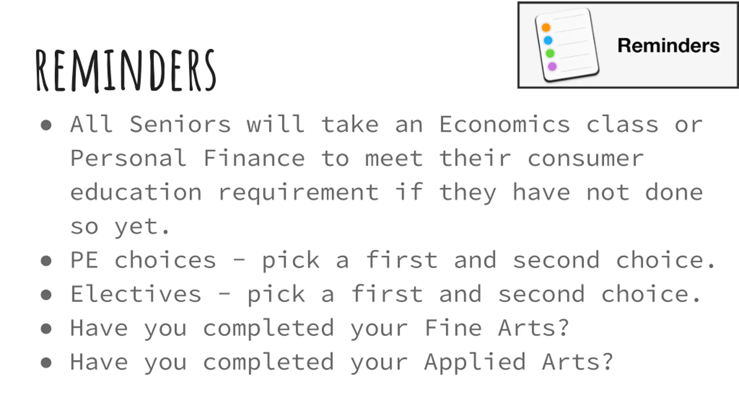 reminders All Seniors will take an Economics class or Personal Finance to meet their consumer education requirement if they have not done so yet. PE choices - pick a first and second choice. Electives - pick a first and second choice. Have you completed your Fine Arts? Have you completed your Applied Arts?