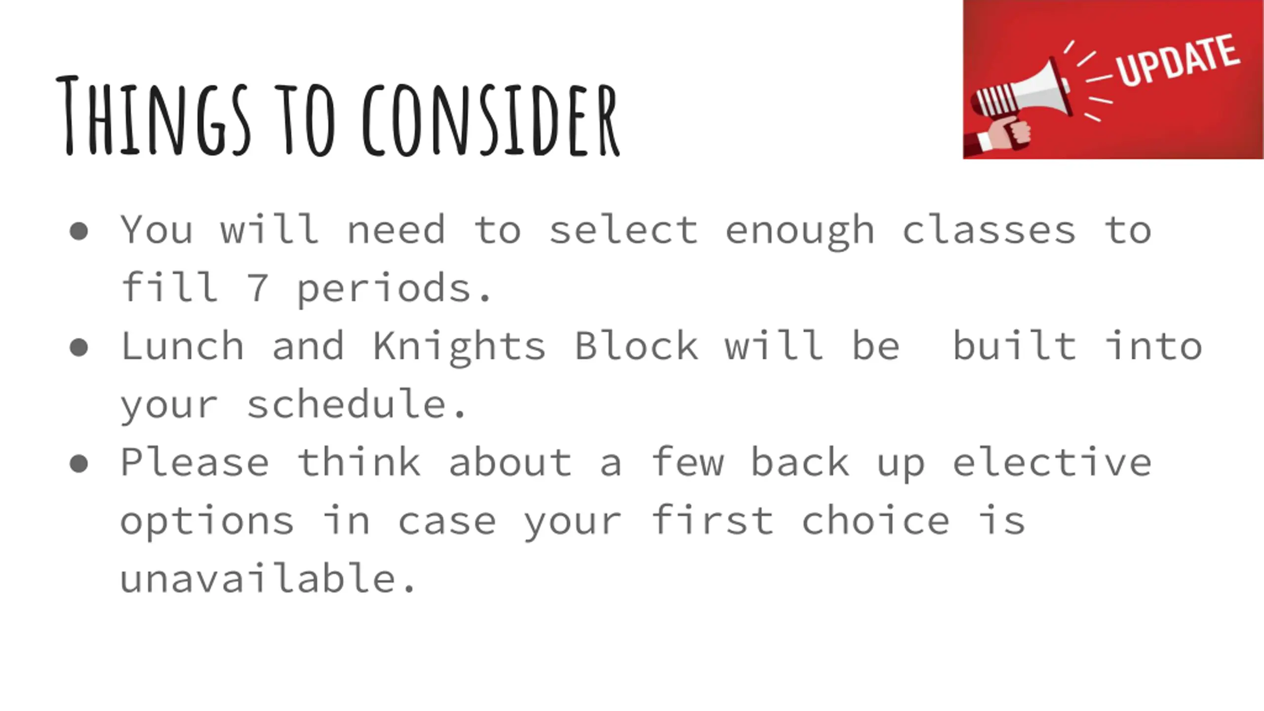 Things to consider You will need to select enough classes to fill 7 periods. Lunch and Knights Block will be built into your schedule. Please think about a few back up elective options in case your first choice is unavailable.