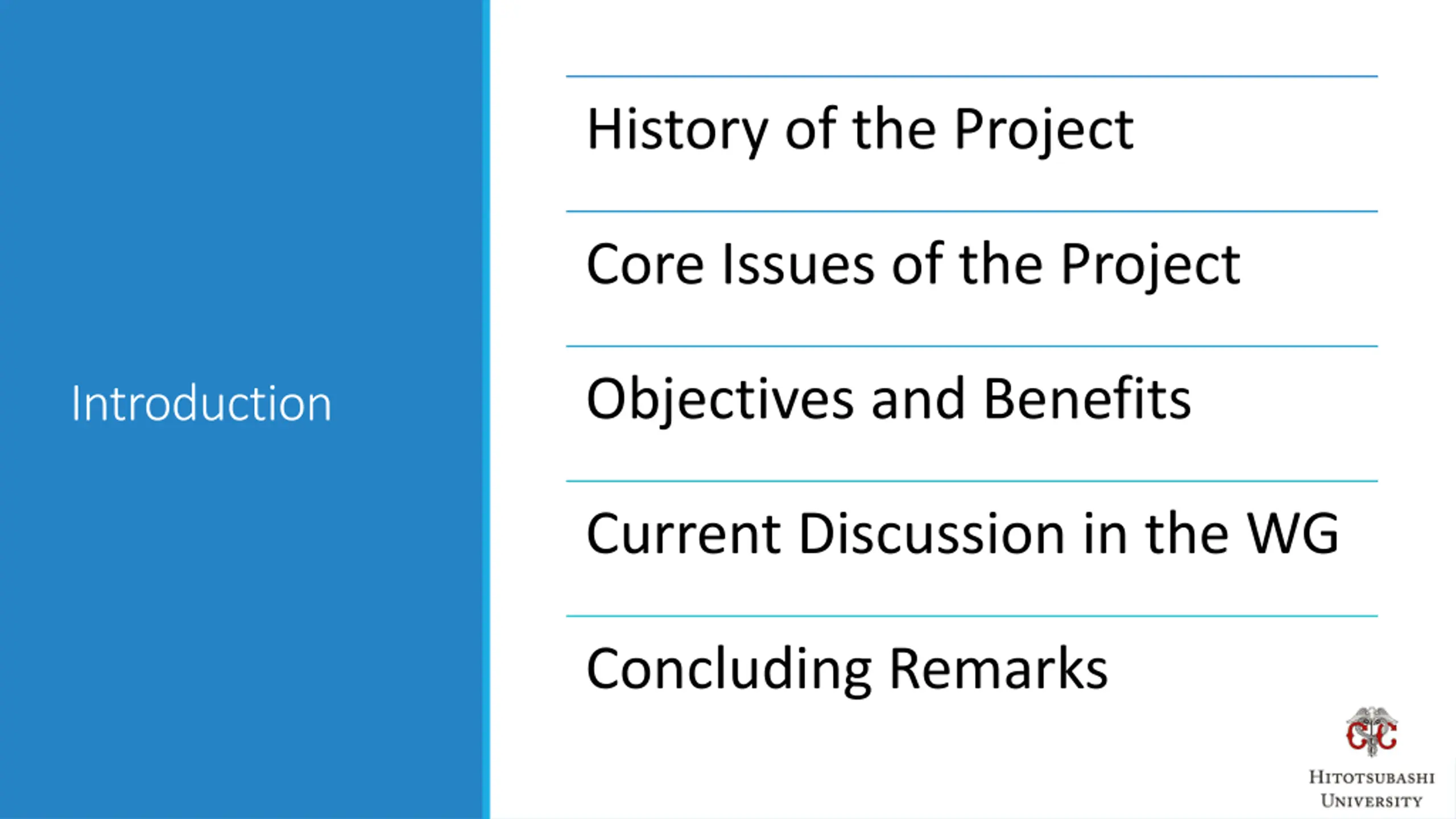 History of the Project Core Issues of the Project Objectives and Benefits Introduction Current Discussion in the WG Concluding Remarks
