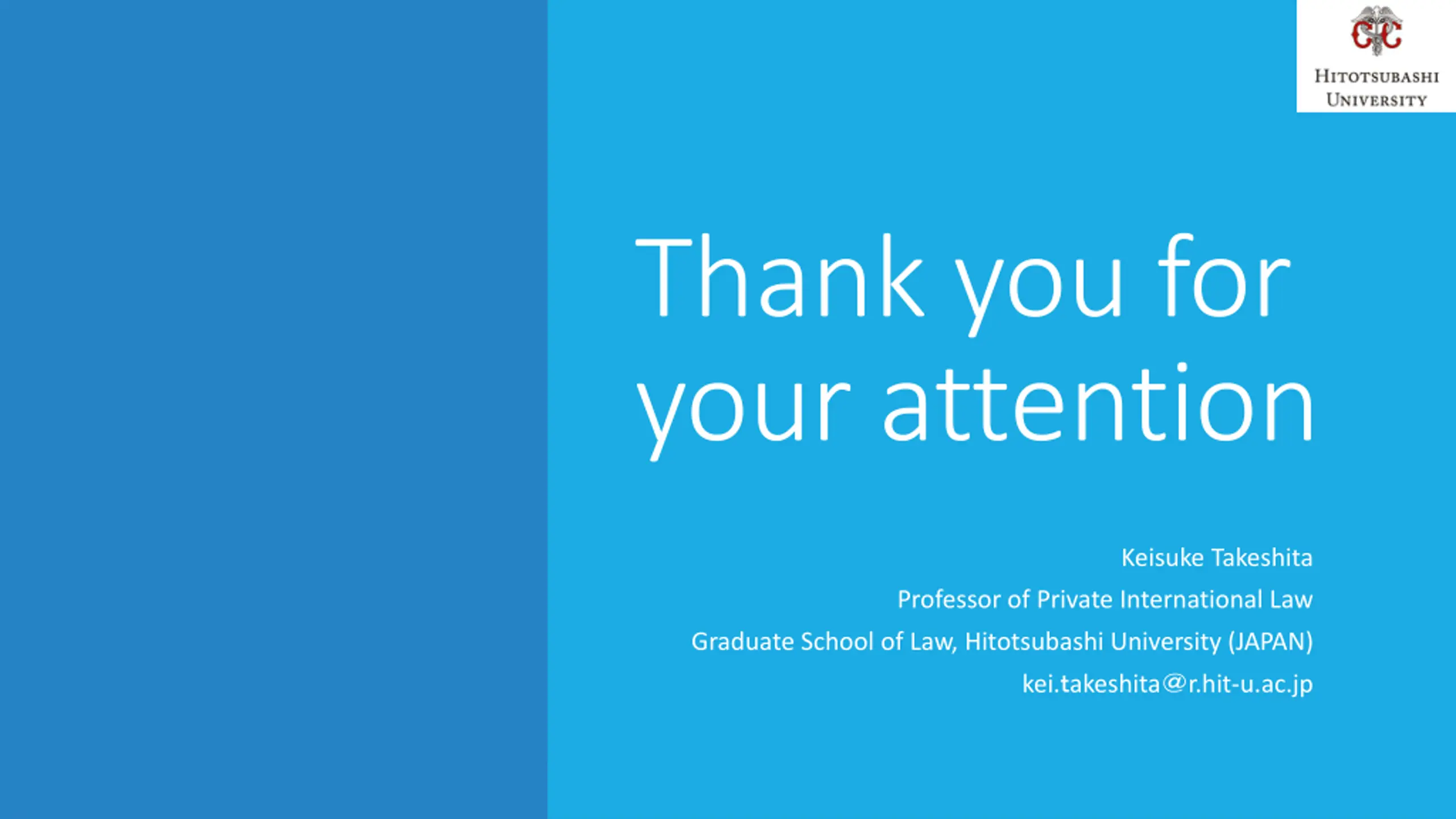 Thank you for your attention Keisuke Takeshita Professor of Private International Law Graduate School of Law, Hitotsubashi University (JAPAN) kei. akeshita r.hit-u.ac.jp